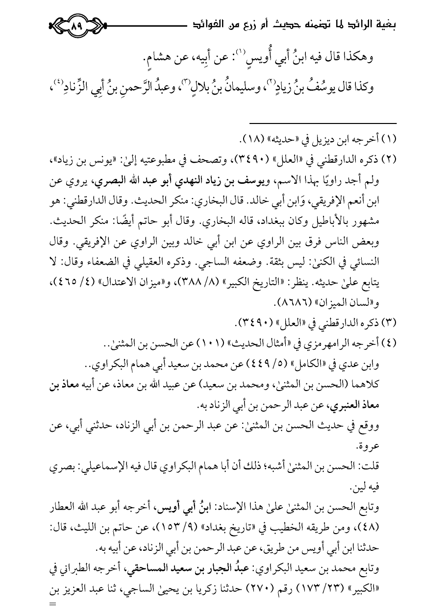 (¬٢) ذكره الدارقطني في «العلل» (٣٤٩٠)، وتصحف في مطبوعتيه إلى: «يونس بن زياد»، ولم أجد راويًا بهذا الاسم، ويوسف بن زياد النهدي أبو عبد الله البصري، يروي عن ابن أنعم الإفريقي، وَابن أبي خالد. قال البخاري: منكر الحديث. وقال الدارقطني: هو مشهور بالأباطيل وكان ببغداد، قاله البخاري. وقال أبو حاتم أيضًا: منكر الحديث. وبعض الناس فرق بين الراوي عن ابن أبي خالد وبين الراوي عن الإفريقي. وقال النسائي في الكنى: ليس بثقة. وضعفه الساجي. وذكره العقيلي في الضعفاء وقال: لا يتابع على حديثه. ينظر: «التاريخ الكبير» (٨/ ٣٨٨)، و «ميزان الاعتدال» (٤/ ٤٦٥)، و «لسان الميزان» (٨٦٨٦).