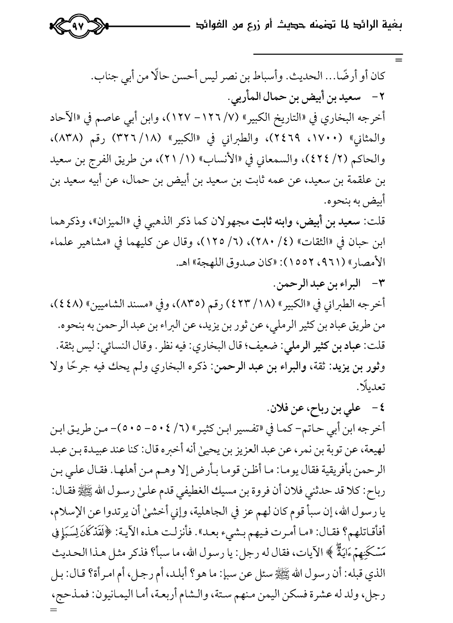 والحديث له شاهد من حديث عبد الله بن عباس، وتميم الداري، وقال ابن كثير بعد ذكر هذه الطرق: «فقوي هذا الحديث وحَسُن» اهـ. وسبقه ابن عبد البر فقال في «الاستيعاب» (٣/ ١٢٦١) في ترجمة فروة بن مسيك: «حديثه في سبإ حديث حسن» اهـ.