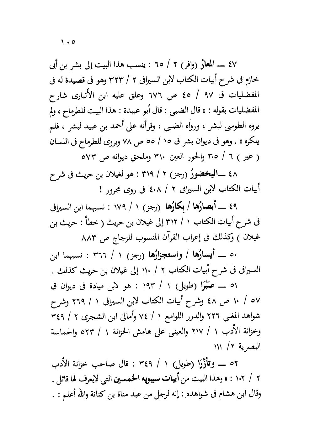 49- أبصارها/ بكارها "رجز" 1/ 179: نسبهما ابن السيرافي في شرح أبيات الكتاب 1/ 312 إلى غيلان بن حريث "خطأ: حريث بن غيلان" وكذلك في إعراب القرآن المنسوب للزجاج ص883.