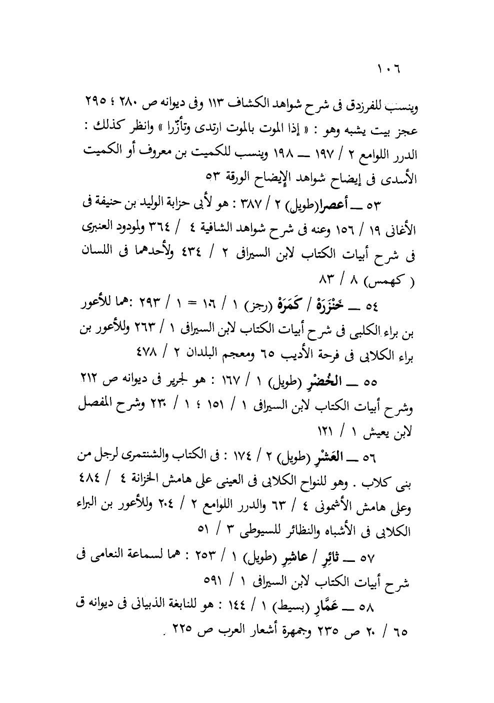 54- خنزره/ كمره "رجز" 1/ 106= 1/ 293: هما للأعور بن براء الكلبي في شرح أبيات الكتاب لابن السيرافي 1/ 263 وللأعور بن براء الكلابي في فرحة الأديب 65 ومعجم البلدان 2/ 478.