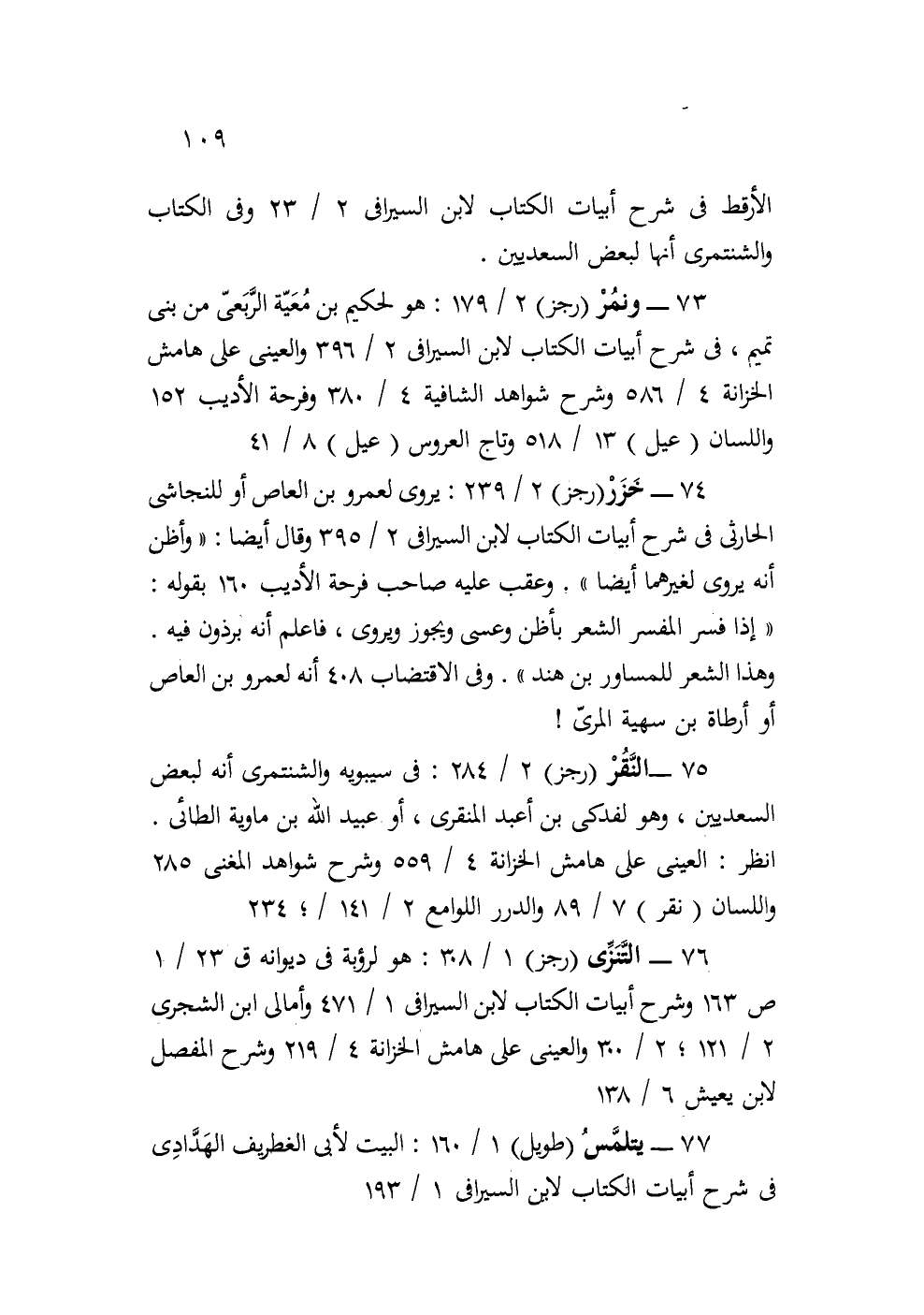 75- النقر "رجز" 2/ 284: في سيبويه والشنتمري أنه لبعض السعديين، وهو لفدكي بن أعبد المنقري، أو عبيد الله بن ماوية الطائي. انظر: العيني على هامش الخزانة 4/ 559 وشرح شواهد المغني 285 واللسان "نقر" 7/ 79 والدرر اللوامع 2/ 141، 234.