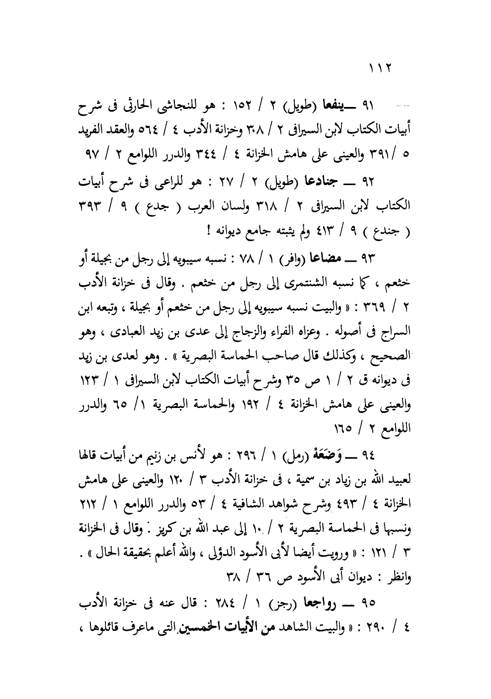 92- جنادعا "طويل" 2/ 27: هو للراعي في شرح أبيات الكتاب لابن السيرافي 2/ 318 ولسان العرب "جدع" 9/ 393 "جندع" 9/ 413 ولم يثبته جامع ديوانه!