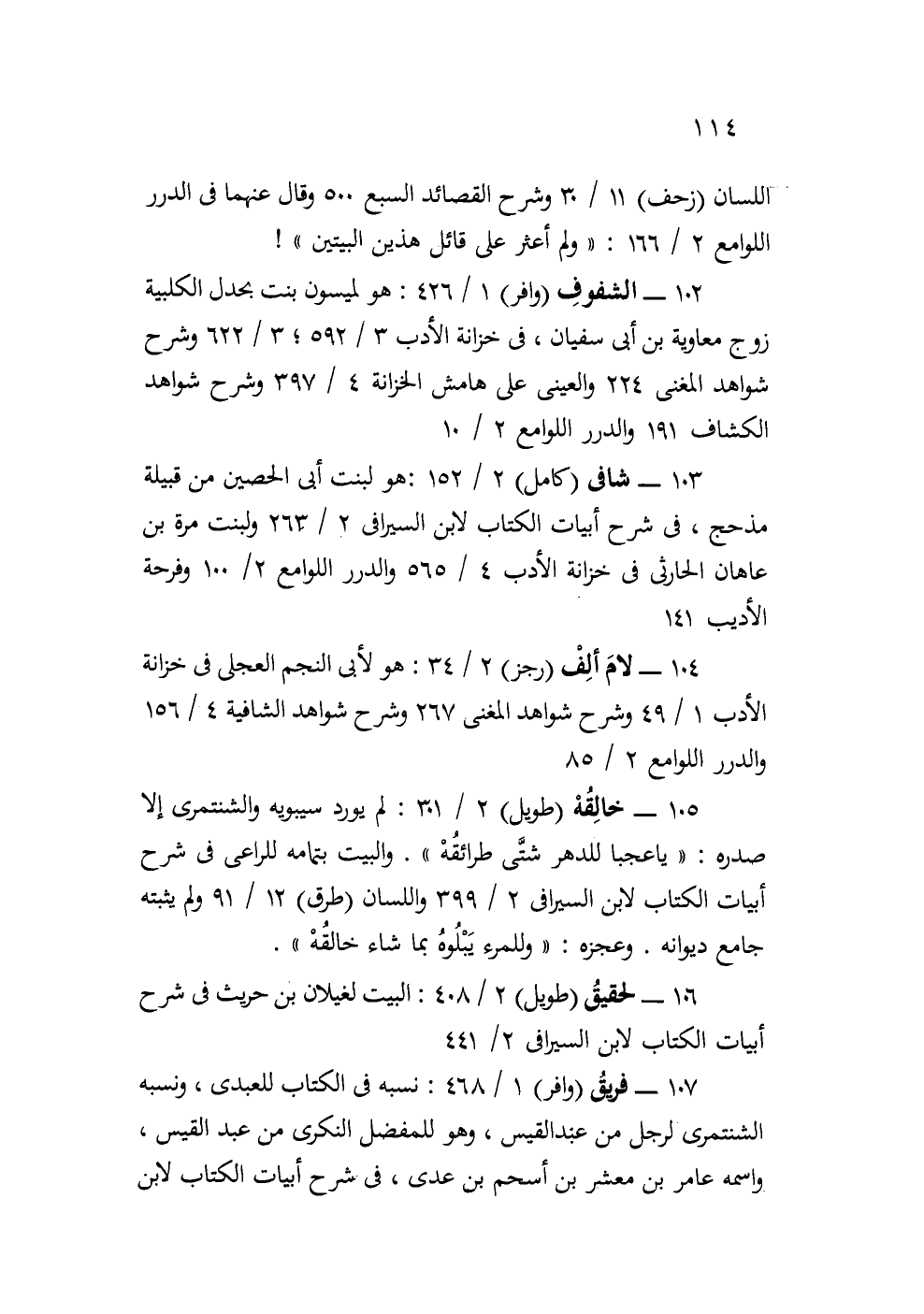 103- شافي "كامل" 2/ 152: هو لبنت أبي الحصين من قبيلة مذحج، في شرح أبيات الكتاب لابن السيرافي 2/ 263 ولبنت مرة بن عاهان الحارثي في خزانة الأدب 4/ 565 والدرر اللوامع 2/ 100 وفرحة الأديب 141.