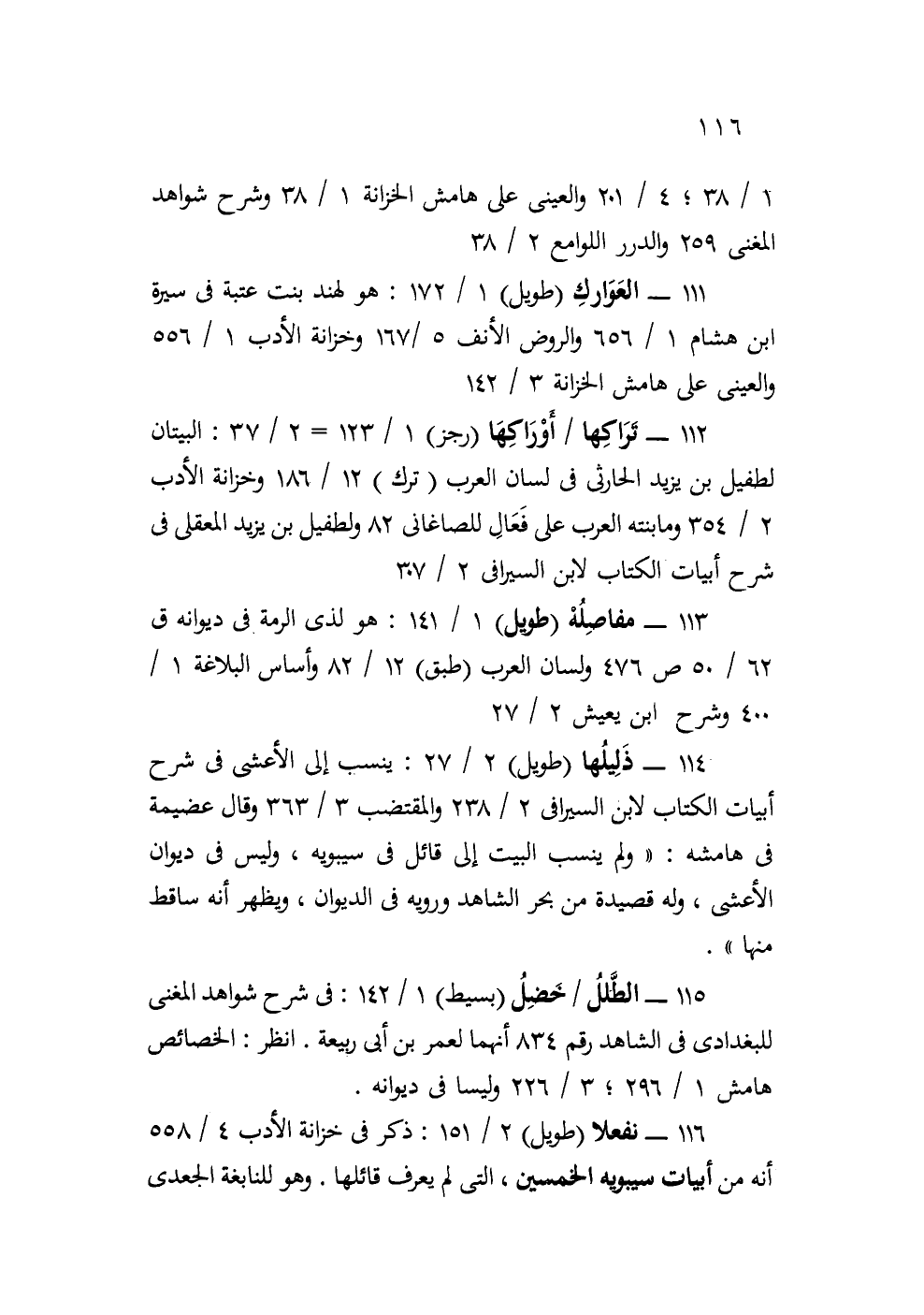 111- العوارك "طويل" 1/ 172: هو لهند بنت عتبة في سيرة ابن هشام 1/ 656 والروض الأنف 5/ 167 وخزانة الأدب 1/ 556 والعيني على هامش الخزانة 3/ 142.