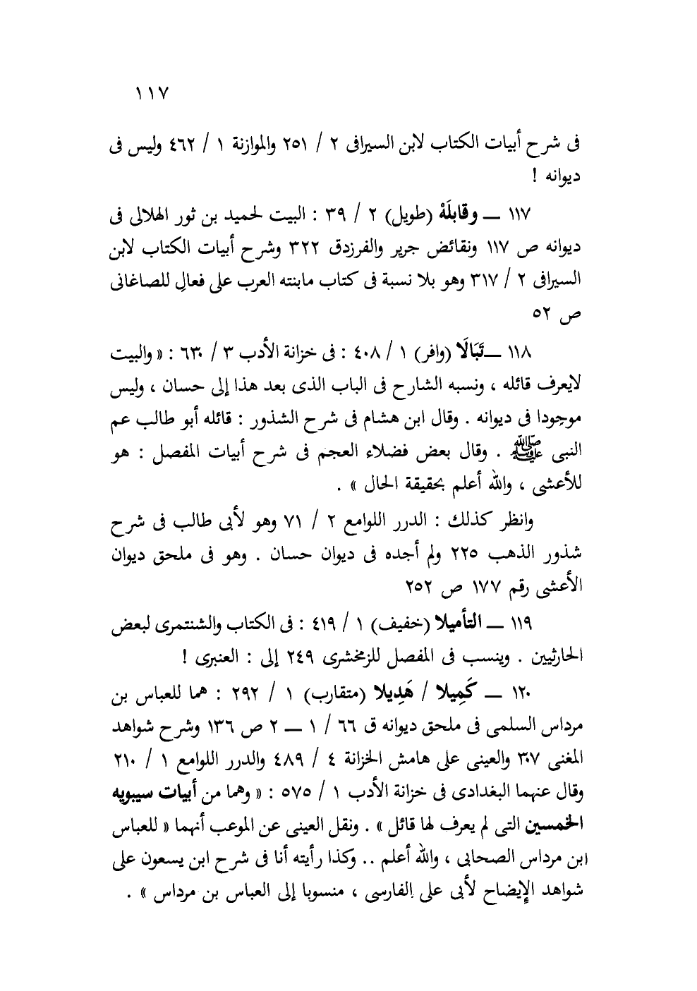 119- التأميلا "خفيف" 1/ 419: في الكتاب والشنتمري لبعض الحارثيين. ويُنسب في المفصل للزمخشري 249 إلى: العنبري!