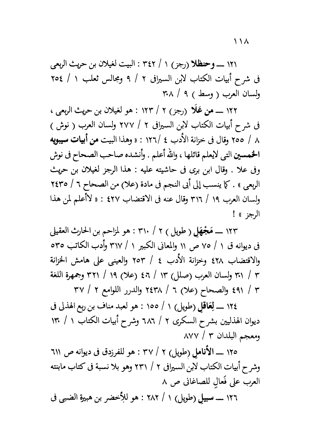 124- لعاقل "طويل" 1/ 155: هو لعبد مناف بن ربع الهذلي في ديوان الهذليين بشرح السكري 2/ 686 وشرح أبيات الكتاب 1/ 130 ومعجم البلدان 3/ 877.