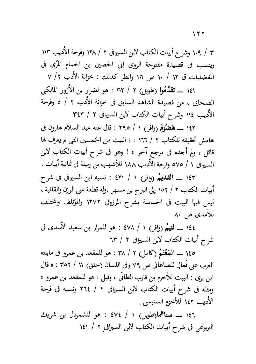 142- هضوم "وافر" 1/ 295: قال عنه عبد السلام هارون في هامش تحقيقه للكتاب 2/ 166: "البيت من الخمسين التي لم يُعرف لها قائل، ولم أجده في مرجع آخر"! وهو في شرح أبيات الكتاب لابن السيرافي 1/ 575 وفرحة الأديب 188 للأشهب بن رميلة في ثمانية أبيات.