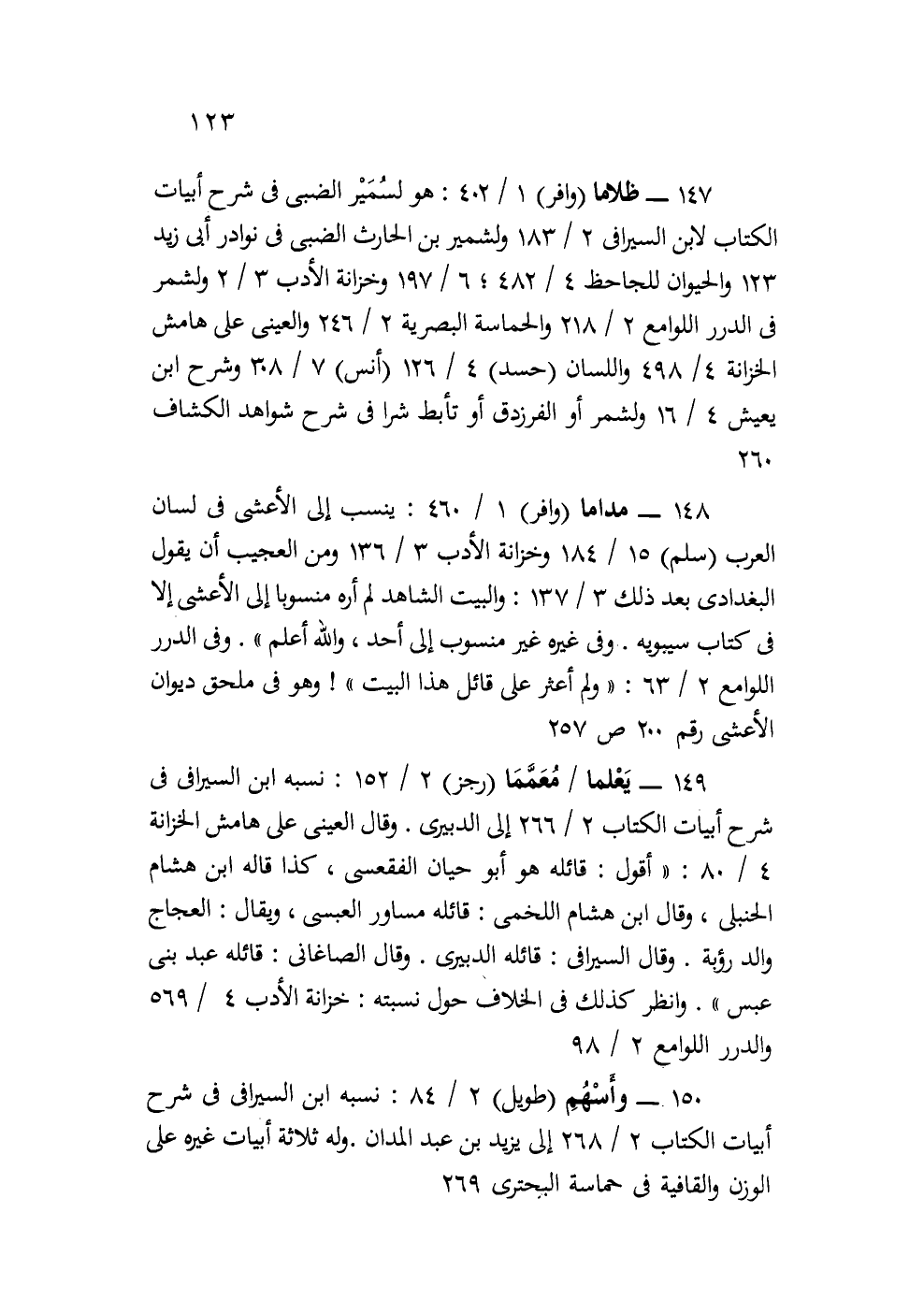 148- مداما "وافر" 1/ 460: يُنسب إلى الأعشى في لسان العرب "سلم" 15/ 184 وخزانة الأدب 3/ 136 ومن العجيب أن يقول البغدادي بعد ذلك 3/ 137: والبيت الشاهد لم أره منسوبا إلى الأعشى إلا في كتاب سيبويه: وفي غيره غير منسوب إلى أحد والله أعلم". وفي الدرر اللوامع 2/ 63: "ولم أعثر على قائل هذا البيت"! وهو في ملحق ديوان الأعشى رقم 200 ص252