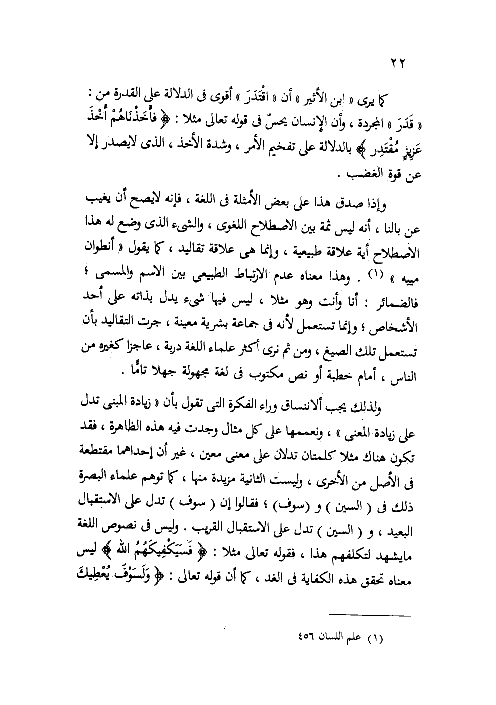 ولذلك يجب ألا ننساق وراء الفكرة التي تقول بأن "زيادة المبنى تدل على زيادة المعنى"، ونعممها على كل مثال وجدت فيه هذه الظاهرة، فقد تكون هناك مثلا كلمتان تدلان على معنى معين، غير أن إحداهما مقتطعة في الأصل من الأخرى، وليست الثانية مزيدة منها، كما توهم علماء البصرة ذلك في "السين" و"سوف"، فقالوا إن "سوف" تدل على الاستقبال البعيد، و"السين" تدل على الاستقبال القريب. وليس في نصوص اللغة ما يشهد لتكلفهم هذا، فقوله تعالى مثلا: {فَسَيَكْفِيكَهُمُ اللَّهُ} ليس معناه تحقق هذه الكفاية في الغد، كما أن قوله تعالى: {وَلَسَوْفَ يُعْطِيكَ