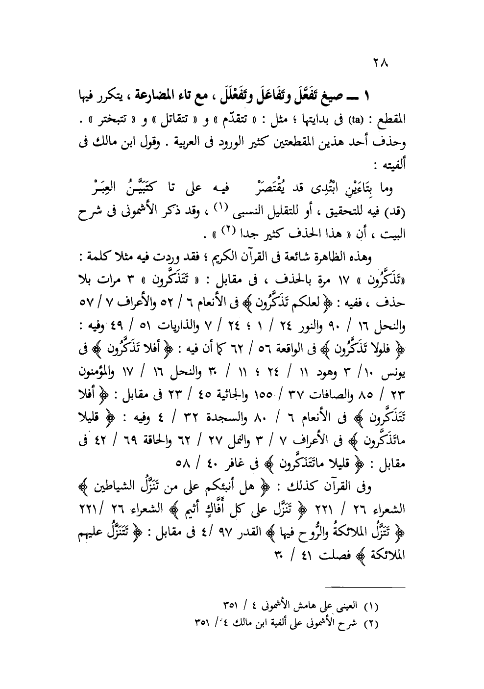 وهذه الظاهرة شائعة في القرآن الكريم، فقد وردت فيه مثلا كلمة: "تذكرون" 17 مرة بالحذف، في مقابل: "تتذكرون" 3 مرات بلا حذف، ففيه: {لَعَلَّكُمْ تَذَكَّرُونَ} [الأنعام: 52 والأعراف: 57 والنحل: 90 والنور: 1، 7 والذاريات: 49] وفيه {فَلَوْلَا تَذَكَّرُونَ} [الواقعة: 62] كما أن فيه: {أَفَلَا تَذَكَّرُونَ} [يونس: 3 وهود: 24، 30 والنحل: 17 والمؤمنون: 85 والصافات: 155 والجاثية: 23] في مقابل: {أَفَلَا تَذَكَّرُونَ} [الأنعام: 80 والسجدة: 4] وفيه: {قَلِيلًا مَا تَذَكَّرُونَ} [غافر: 58] .