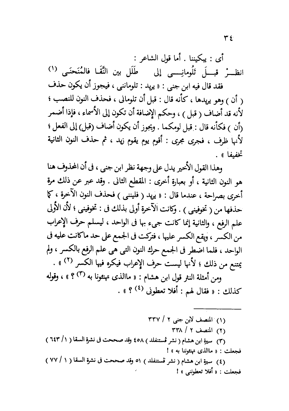 وهذا القول الأخير يدل على وجهة نظر ابن جني، في أن المحذوف هنا هو النون الثانية، أو بعبارة أخرى: المقطع الثاني. وقد عبر عن ذلك مرة أخرى بصراحة، عندما قال: "يريد "فلينني" فحذف النون الآخرة، كما حذفها من "تخوفيني". وكانت الآخرة أولى بذلك في: تخوفيني؛ لأن الأولى علم الرفع، والثانية إنما كانت جيء بها في الواحد، ليسلم حرف الإعراب من الكسر، ويقع الكسر عليها، فتركت في الجمع على حد ما كانت عليه في الواحد، فلما اضطر في الجمع حرك النون التي هي علم الرفع بالكسر، ولم يمتنع من ذلك؛ لأنها ليست حرف الإعراب فيكره فيها الكسر"2.