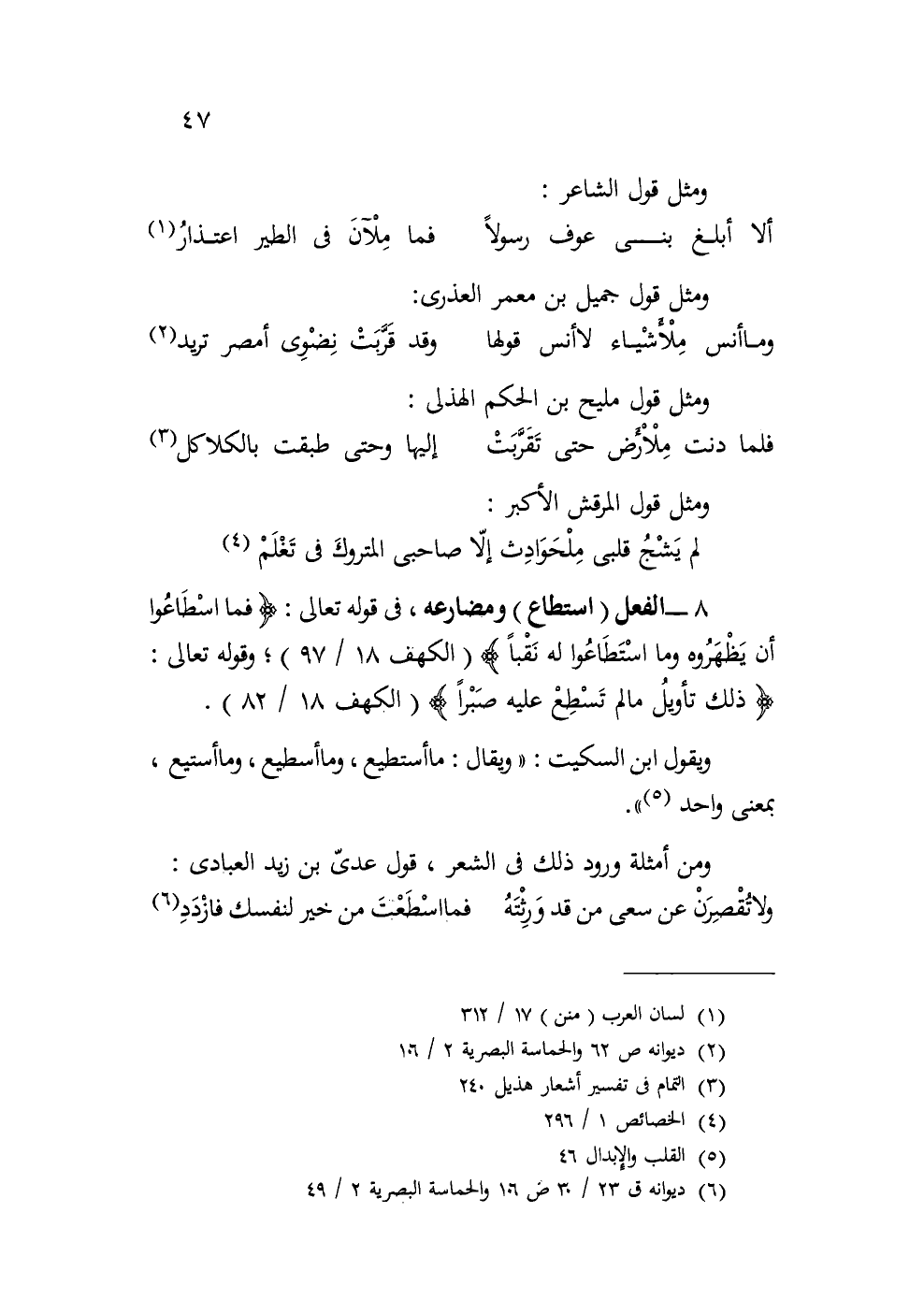 8- الفعل "استطاع" ومضارعه، في قوله تعالى: {فَمَا اسْطَاعُوا أَنْ يَظْهَرُوهُ وَمَا اسْتَطَاعُوا لَهُ نَقْبًا} [الكهف: 97] ، وقوله تعالى: {ذَلِكَ تَأْوِيلُ مَا لَمْ تَسْطِعْ عَلَيْهِ صَبْرًا} [الكهف: 82] .