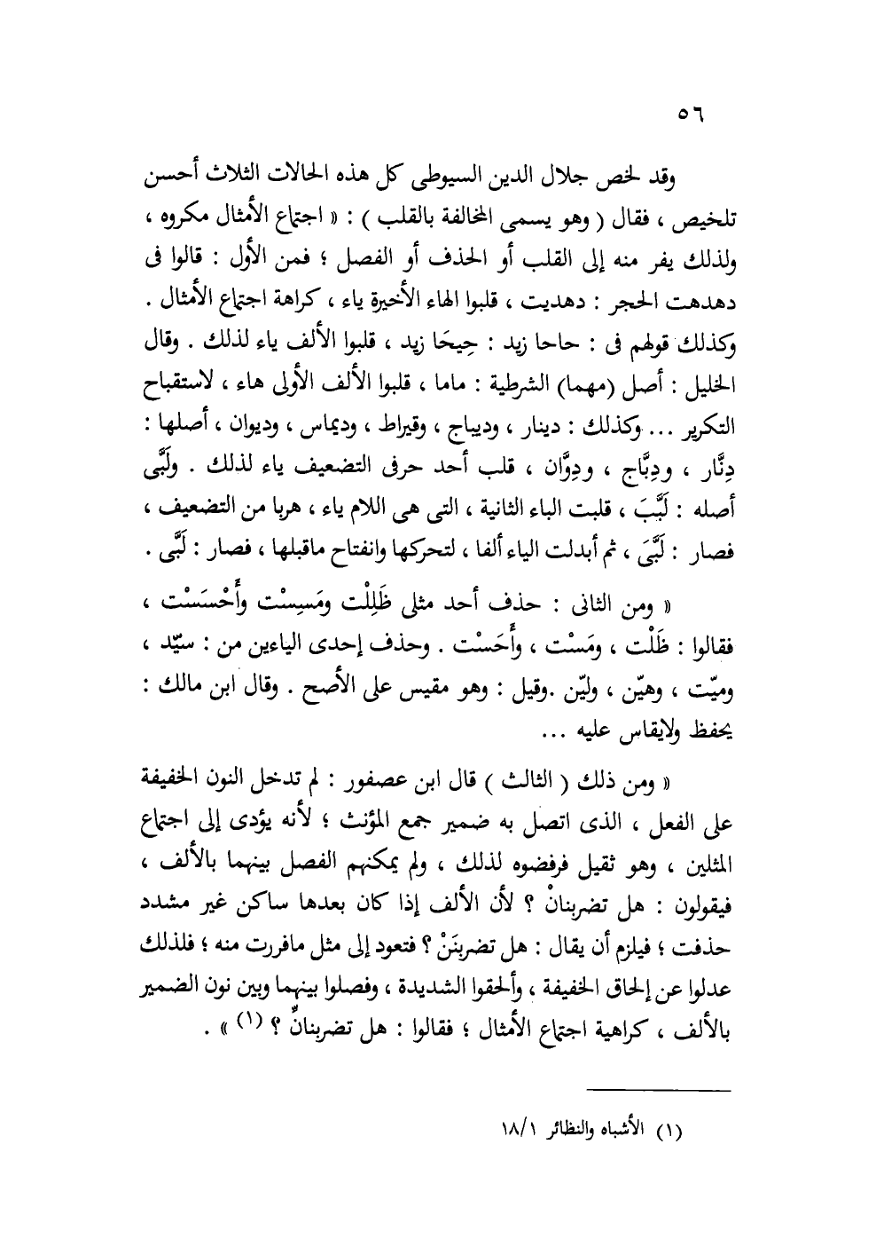 "ومن الثاني: حذف أحد مثلى ظللت ومسست وأحسست، فقالوا: ظلت، ومست، وأحست. وحذف إحدى الياءين من: سيّد، وميّت، وهيّن، وليّن. وقيل: وهو مقيس على الأصح. وقال ابن مالك: يحفظ ولا يقاس عليه ...