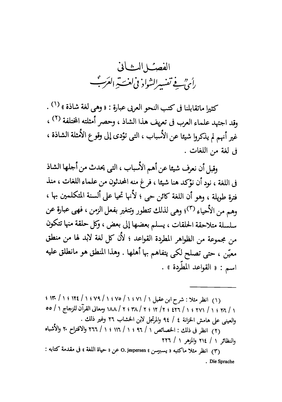 وقد اجتهد علماء العرب في تعريف هذا الشاذ، وحصر أمثلته المختلفة2، غير أنهم لم يذكروا شيئا عن الأسباب، التي تؤدي إلى وقوع الأمثلة الشاذة، في لغة من اللغات.