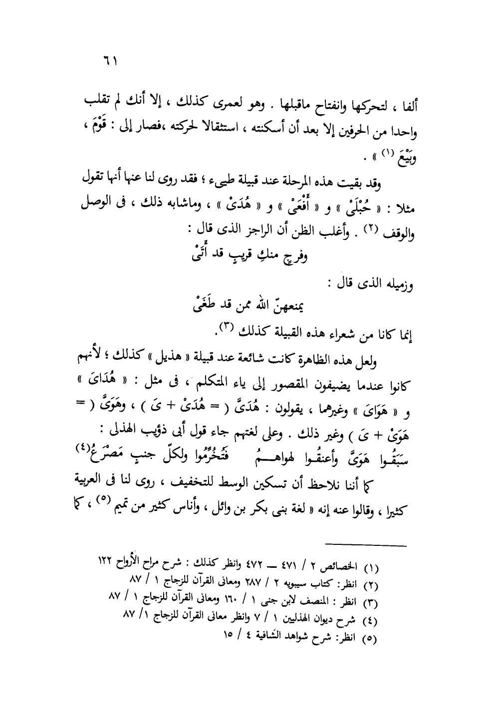 وقد بقيت هذه المرحلة عند قبيلة طيئ، فقد روى لنا عنها أنها تقول مثلا: "حبلى" و"أفعى" و"هدى"، وما شابه ذلك، في الوصل والوقف2. وأغلب الظن أن الراجز الذي قال: