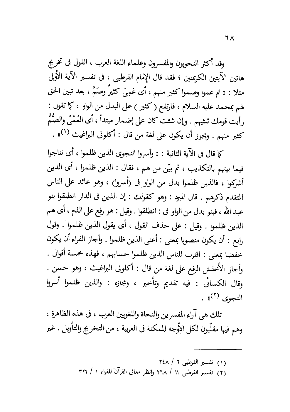 وقد أكثر النحويون والمفسرون علماء اللغة العرب، القول في تخريج هاتين الآيتين الكريمتين، فقد قال الإمام القرطبي، في تفسير الآية الأولى مثلا: " {ثُمَّ عَمُوا وَصَمُّوا كَثِيرٌ مِنْهُمْ} ، أي عمي كثير وصم، بعد تبين الحق لهم بمحمد عليه السلام، فارتفع "كثير" على البدل من الواو، كما تقول: رأيت قومك ثلثيهم، وإن شئت كان على إضمار مبتدأ، أي العمي والصم كثير منهم. ويجوز أن يكون على لغة من قال: أكلوني البراغيث"1.