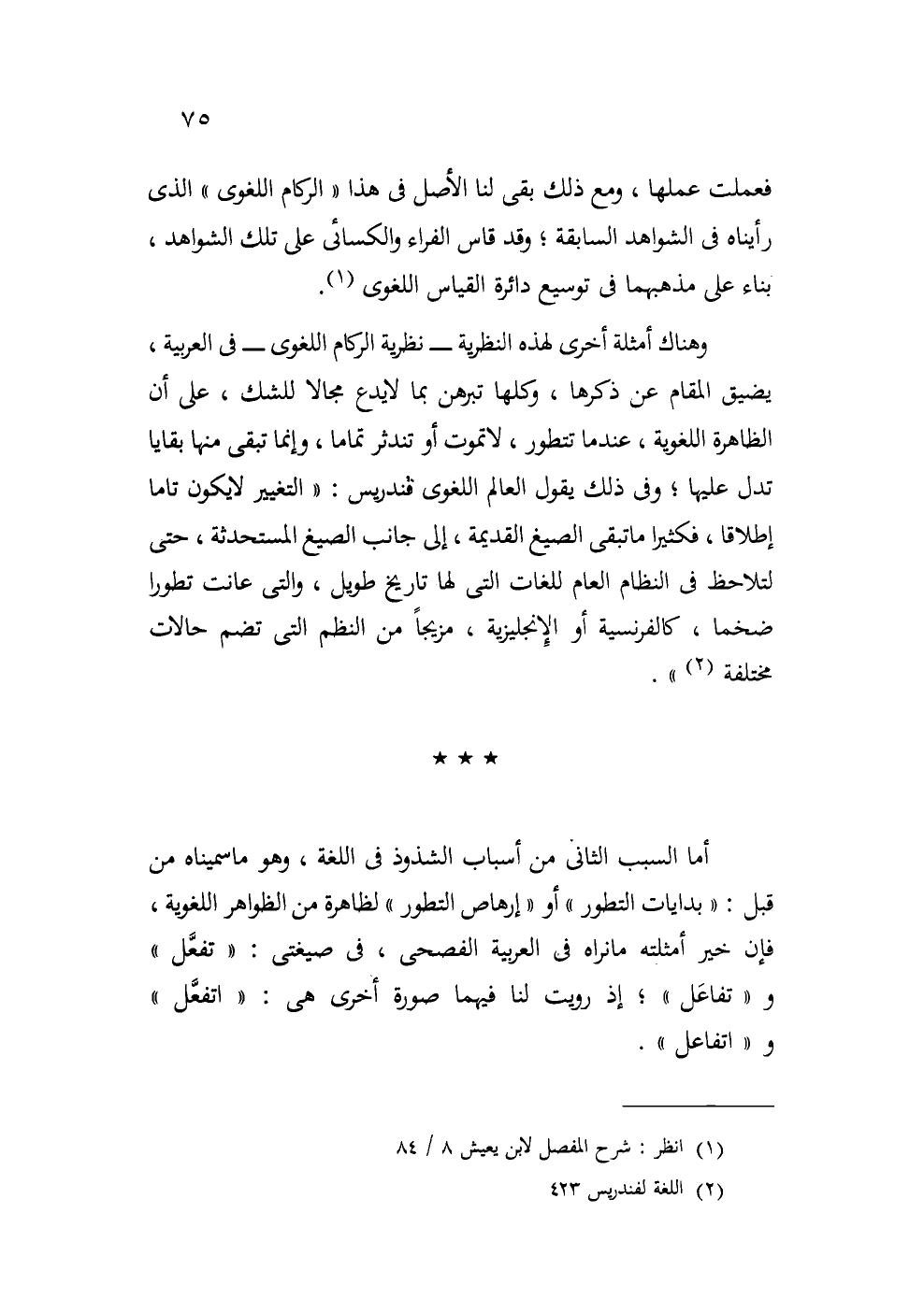وهناك أمثلة أخرى لهذه النظرية -نظرية الركام اللغوي- في العربية، يضيق المقام عن ذكرها وكلها تبرهن بما لا يدع مجالا للشك، على أن الظاهرة اللغوية، عندما تتطور، لا تموت أو تندثر تماما، وإنما تبقى منها بقايا تدل عليها، وفي ذلك يقول العالم اللغوي فندريس: "التغيير لا يكون تاما إطلاقا، فكثيرا ما تبقى الصيغ القديمة، إلى جانب الصيغ المستحدثة، حتى لتلاحظ في النظام العام للغات التي لها تاريخ طويل، والتي عانت تطورا ضخما، كالفرنسية أو الإنجليزية، مزيجا من النظم التي تضم حالات مختلفة"2.