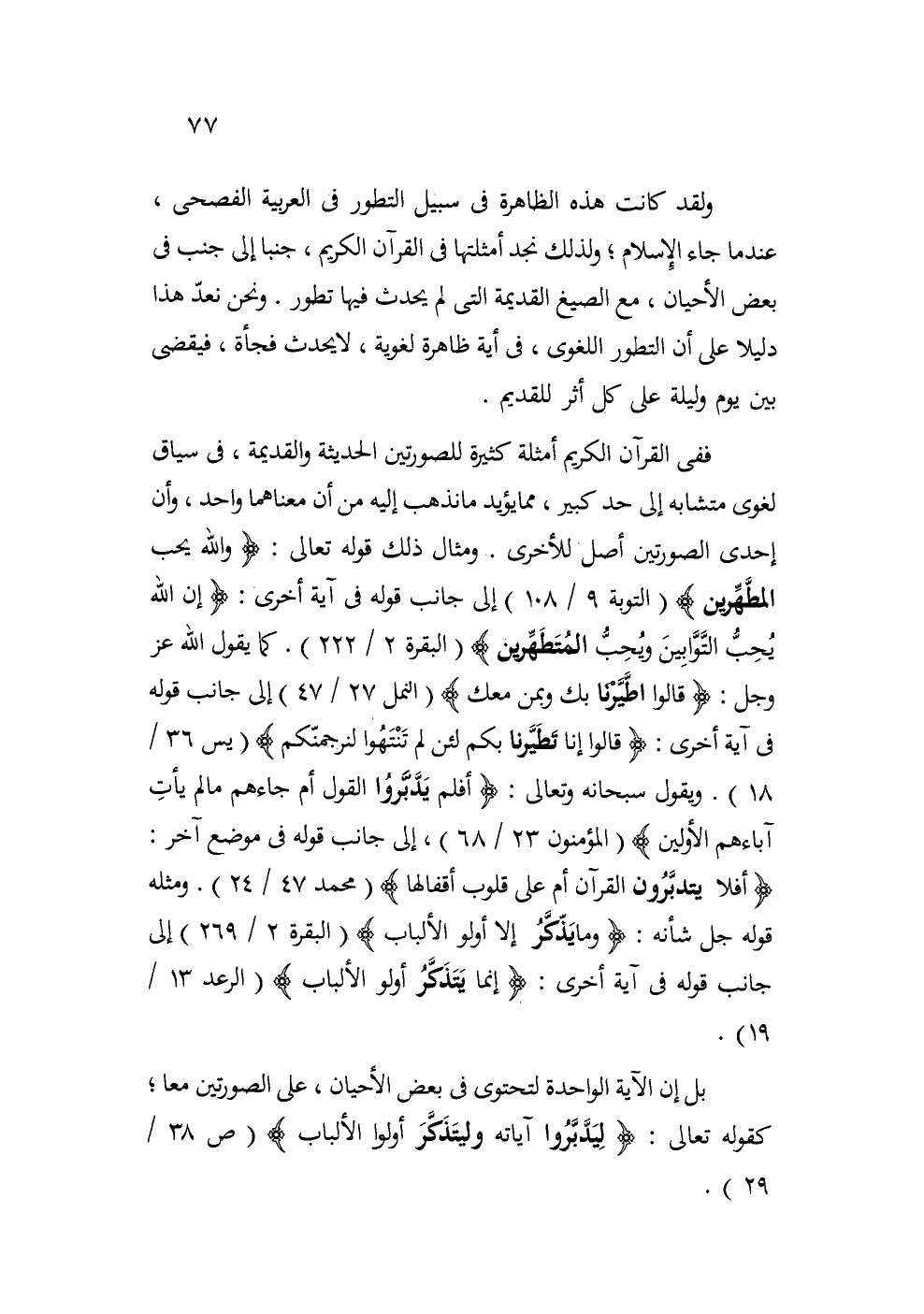 ففي القرآن الكريم أمثلة كثيرة للصورتين الحديثة والقديمة، في سياق لغوي متشابه إلى حد كبير، مما يؤيد ما نذهب إليه من أن معناهما واحد، وأن إحدى الصورتين أصل للأخرى، ومثال ذلك قوله تعالى: {وَاللَّهُ يُحِبُّ الْمُطَّهِّرِينَ} [التوبة: 108] إلى جانب قوله في آية أخرى: {إِنَّ اللَّهَ يُحِبُّ التَّوَّابِينَ وَيُحِبُّ الْمُتَطَهِّرِينَ} [البقرة: 222] . كما يقول الله عز وجل: {قَالُوا إِنَّا تَطَيَّرْنَا بِكُمْ لَئِنْ لَمْ تَنْتَهُوا لَنَرْجُمَنَّكُمْ} [يس: 18] . ويقول سبحانه وتعالى: {أَفَلَمْ يَدَّبَّرُوا الْقَوْلَ أَمْ جَاءَهُمْ مَا لَمْ يَأْتِ آبَاءَهُمُ الْأَوَّلِينَ} [المؤمنون: 68] ، إلى جانب قوله في موضع آخر: {أَفَلَا يَتَدَبَّرُونَ الْقُرْآنَ أَمْ عَلَى قُلُوبٍ أَقْفَالُهَا} [محمد: 24] . ومثله قوله جل شأنه: {وَمَا يَذَّكَّرُ إِلَّا أُولُو الْأَلْبَابِ} [البقرة: 269] إلى جانب قوله في آية أخرى: {إِنَّمَا يَتَذَكَّرُ أُولُو الْأَلْبَابِ} [الرعد: 19] .