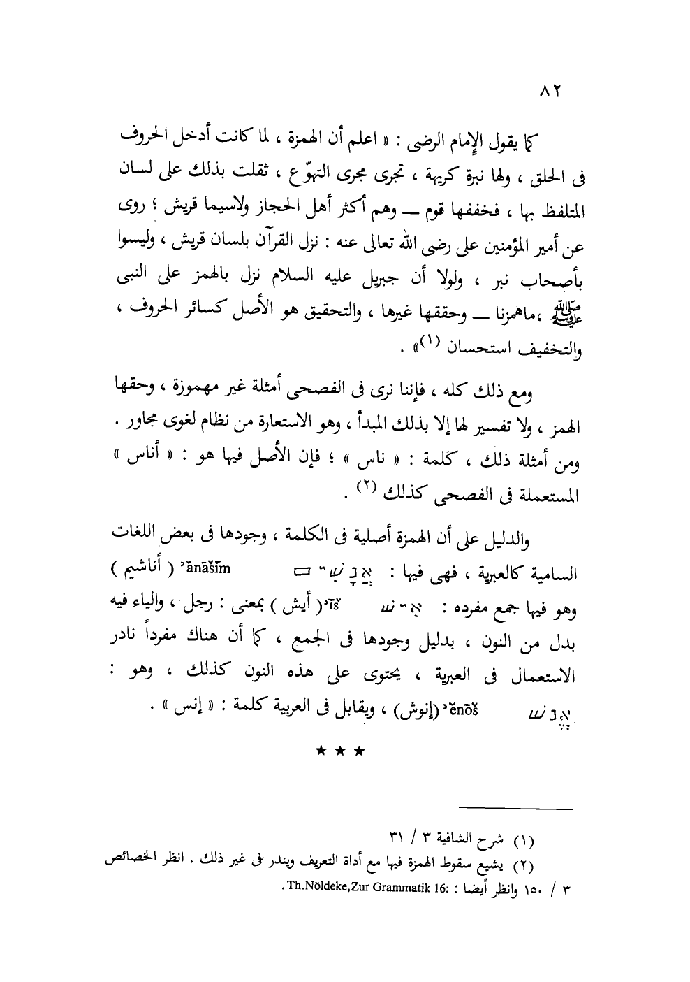 2 يشيع سقوط الهمزة فيها مع أداة التعريف ويندر في غير ذلك. انظر الخصائص 3/ 150 وانظر أيضا: The Noldeke, zur Grammatik 16.