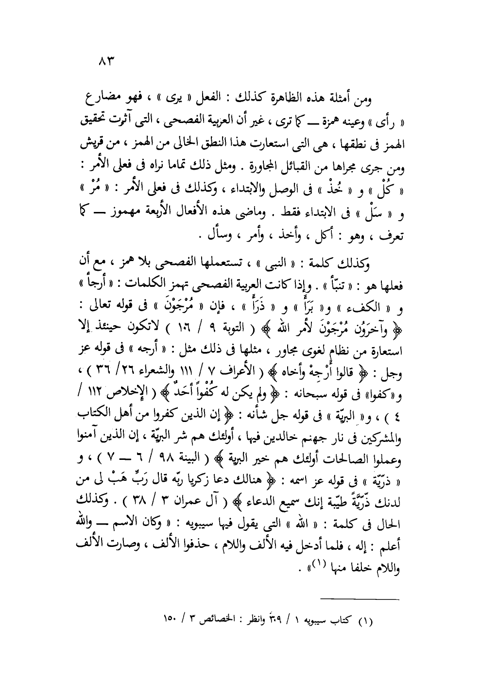وكذلك كلمة: "النبي"، تستعملها الفصحى بلا همز، مع أن فعلها هو: "تنبأ". وإذا كانت العربية الفصحى تهمز الكلمات: "أرجأ". و"الكفء" و"برأ" و"ذرأ"، فإن "مرجون" في قوله تعالى: {وَآخَرُونَ مُرْجَوْنَ لِأَمْرِ اللَّهِ} [التوبة: 106] لا تكون حينئذ إلا استعارة من نظام لغوي مجاور، مثلها في ذلك مثل: "أرجه" في قوله عز وجل: {قَالُوا أَرْجِهْ وَأَخَاهُ} [الأعراف: 111، والشعراء: 36] و"كفوا" في قوله سبحانه: {وَلَمْ يَكُنْ لَهُ كُفُوًا أَحَدٌ} [الإخلاص: 4] ، و"البرية" في قوله جل شأنه: {إِنَّ الَّذِينَ كَفَرُوا مِنْ أَهْلِ الْكِتَابِ وَالْمُشْرِكِينَ فِي نَارِ جَهَنَّمَ خَالِدِينَ فِيهَا أُولَئِكَ هُمْ شَرُّ الْبَرِيَّةِ، إِنَّ الَّذِينَ آمَنُوا وَعَمِلُوا الصَّالِحَاتِ أُولَئِكَ هُمْ خَيْرُ الْبَرِيَّة} [البينة: 6، 7] ، و" ذرية" في قوله عز اسمه: {هُنَالِكَ دَعَا زَكَرِيَّا رَبَّهُ قَالَ رَبِّ هَبْ لِي مِنْ لَدُنْكَ ذُرِّيَّةً طَيِّبَةً إِنَّكَ سَمِيعُ الدُّعَاءِ} [آل عمران: 38] . وكذلك الحال في كلمة: "الله" التي يقول فيها سيبويه: "وكان الاسم -والله أعلم: إله، فلما أدخل فيه الألف واللام، حذفوا الألف، وصارت الألف واللام خلفا منها"1.