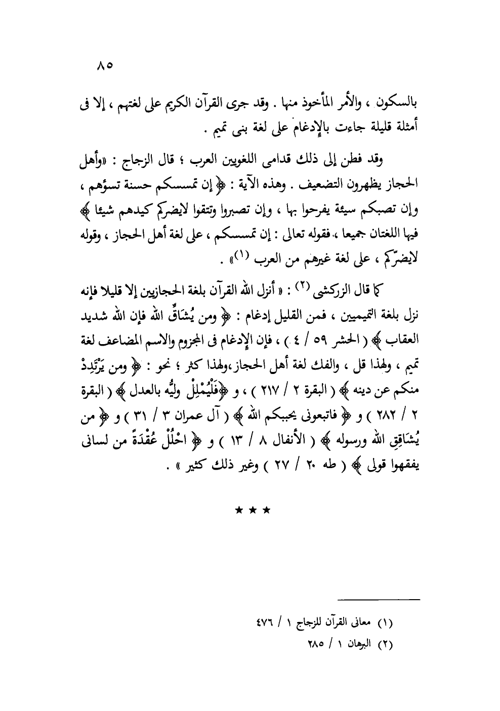 كما قال الزركشي2: "أنزل الله القرآن بلغة الحجازيين إلا قليلا فإنه نزل بلغة التميميين، فمن القليل إدغام: {وَمَنْ يُشَاقِّ اللَّهَ فَإِنَّ اللَّهَ شَدِيدُ الْعِقَابِ} [الحشر: 4] ، فإن الإدغام في المجزوم والاسم المضاعف لغة تميم، ولهذا قل، والفك لغة أهل الحجاز، ولهذا كثر، نحو: {وَمَنْ يَرْتَدِدْ مِنْكُمْ عَنْ دِينِهِ} [البقرة: 217] ، و {فَلْيُمْلِلْ وَلِيُّهُ بِالْعَدْلِ} [البقرة: 282] و {فَاتَّبِعُونِي يُحْبِبْكُمُ اللَّهُ} [آل عمران: 31] و {مَنْ يُشَاقِقِ اللَّهَ وَرَسُولَهُ} [الأنفال: 13] و {احْلُلْ عُقْدَةً مِنْ لِسَانِي، يَفْقَهُوا قَوْلِي} [طه: 27] وغير ذلك كثير".