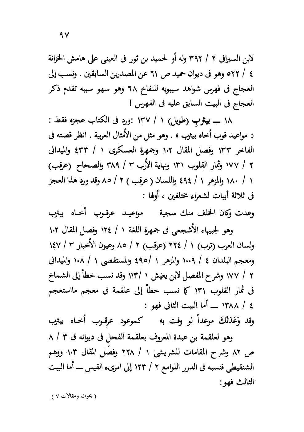 18- بيثرب "طويل" 1/ 137: ورد في الكتاب عجزه فقط: "مواعيد عرقوب أخاه بيثرب". وهو مثل من الأمثال العربية. انظر قصته في الفاخر 133 وفصل المقال 102 وجمهرة العسكري 1/ 433 والميداني 2/ 177 وثمار القلوب 131 ونهاية الأرب 3/ 389 والصحاح "عرقب" 1/ 180 والمزهر 1/ 494 واللسان "عرقب" 2/ 85 وقد ورد هذا العجز في ثلاثة أبيات لشعراء مختلفين، أولها: