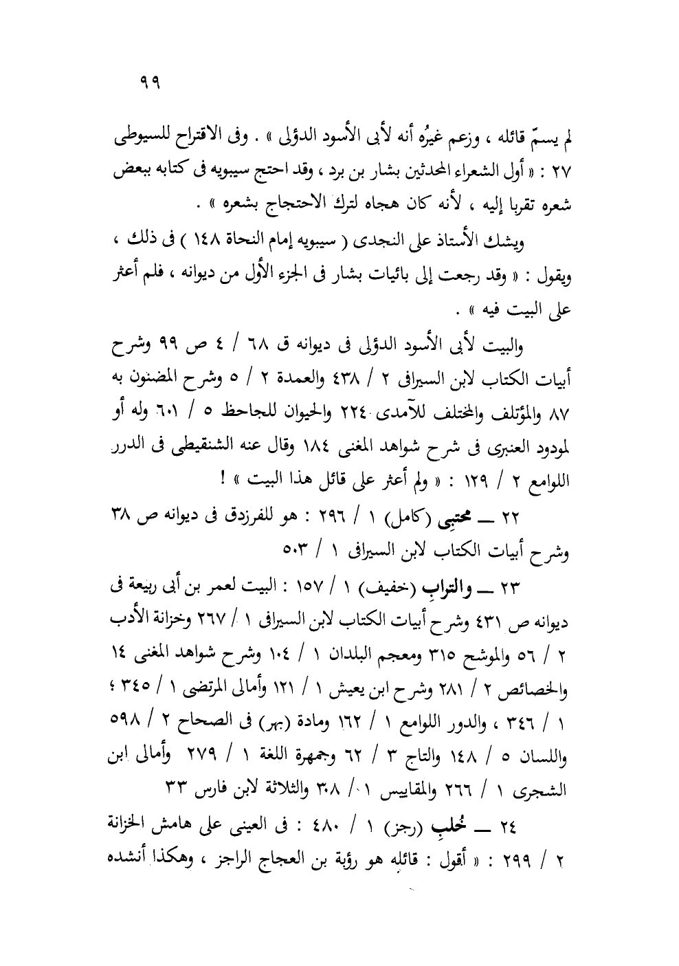 لم يسم قائله، وزعم غيره أنه لأبي الأسود الدؤلي". وفي الاقتراح للسيوطي 27: "أول الشعراء المحدثين بشار بن برد، وقد احتج سيبويه في كتابه ببعض شعره تقربا إليه؛ لأنه كان هجاه لترك الاحتجاج بشعره".