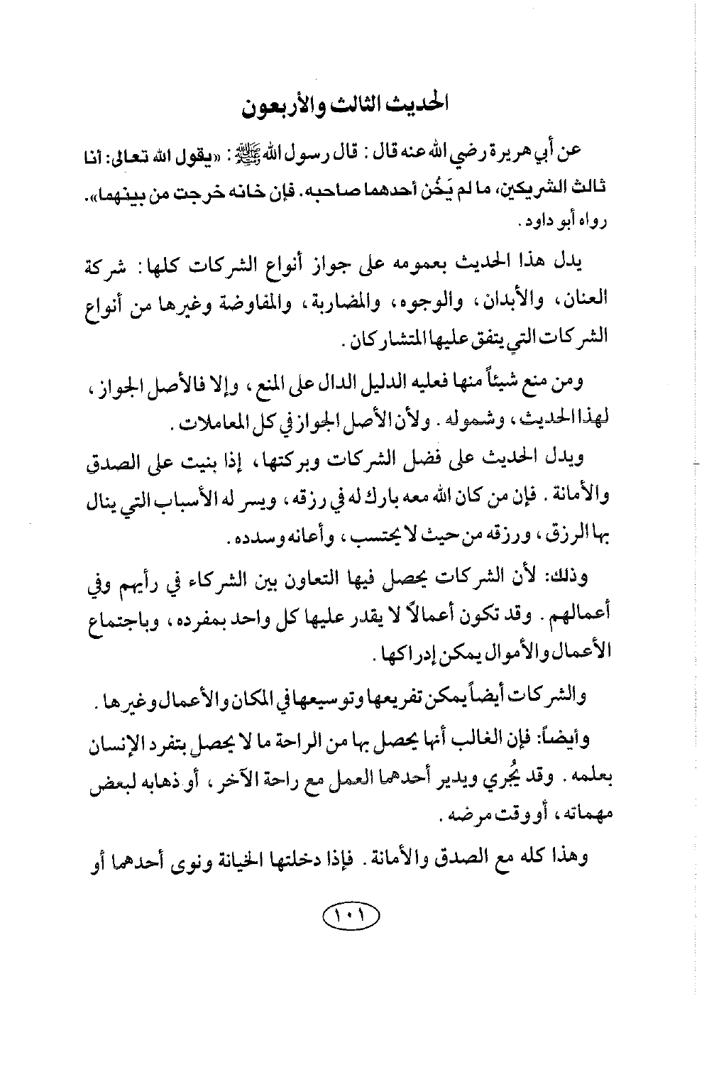 الحديث الثالث والأربعون عن أبي هريرة رضي الله عنه قال: قال رسول الله صلى الله عليه وسلم: «يَقُولُ اللَّهُ تَعَالَى: أَنَا ثَالِثُ الشَّرِيكَيْنِ، مَا لم يخن أحدهما صاحبه، فإن خَانَهُ خَرَجْتُ مِنْ بَيْنِهِمَا» . رَوَاهُ أَبُو دَاوُدَ.