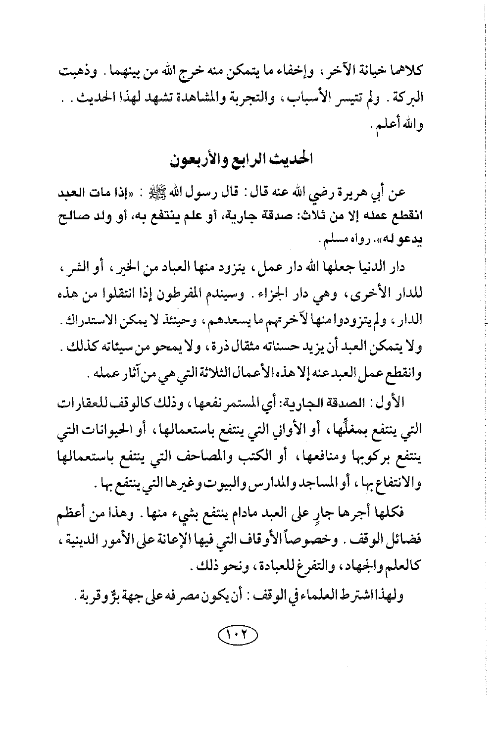 الحديث الرابع والأربعون عن أبي هريرة رضي الله عنه قال: قال رسول الله صلى الله عليه وسلم: «إِذَا مَاتَ الْعَبْدُ انْقَطَعَ عَمَلُهُ إِلَّا مِنْ ثَلَاثٍ: صَدَقَةٍ جَارِيَةٍ، أَوْ عِلْمٍ يُنْتَفَعُ بِهِ، أَوْ وَلَدٍ صَالِحٍ يَدْعُو لَهُ» . رَوَاهُ مُسْلِمٌ.