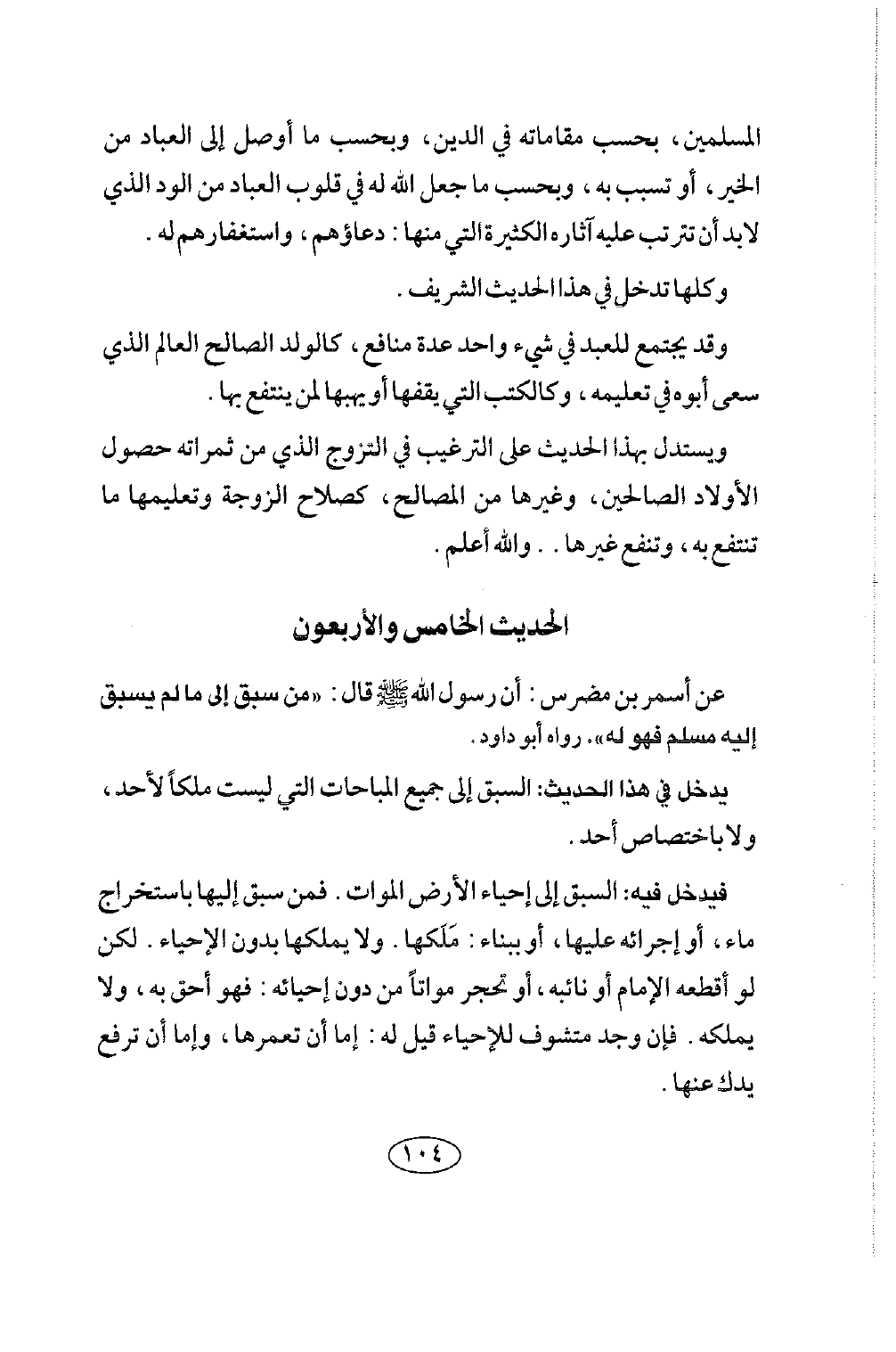 الحديث الخامس والأربعون عَنْ أَسْمَرَ بْنِ مُضَرِّسٍ: أنَّ رَسُولَ اللَّهِ صلى الله عليه وسلم قَالَ: «مَنْ سَبَقَ إِلَى مَا لَمْ يَسْبِقْ إِلَيْهِ مُسْلِمٌ فَهُوَ له» . رواه أبو داود.