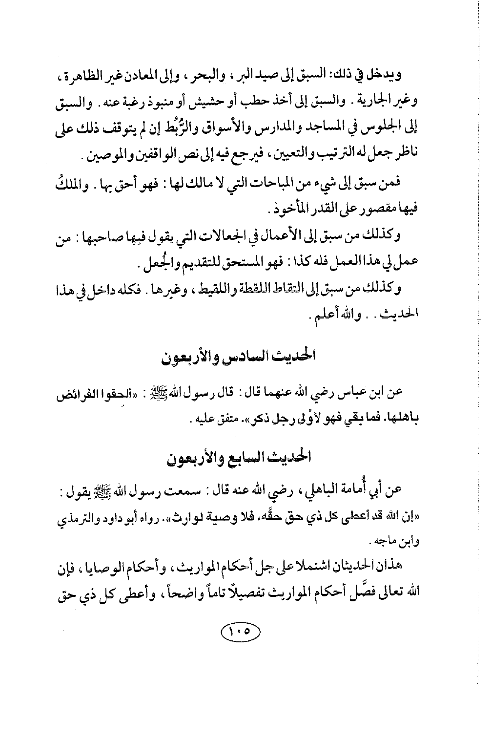 الحديث السادس والأربعون عن ابن عباس رضي الله عنه قَالَ: قَالَ رَسُولُ اللَّهِ صلى الله عليه وسلم: «أَلْحِقُوا الْفَرَائِضَ بِأَهْلِهَا، فَمَا بَقِيَ فَهُوَ لِأَوْلَى رَجُلٍ ذَكَرٍ» . مُتَّفَقٌ عليه.