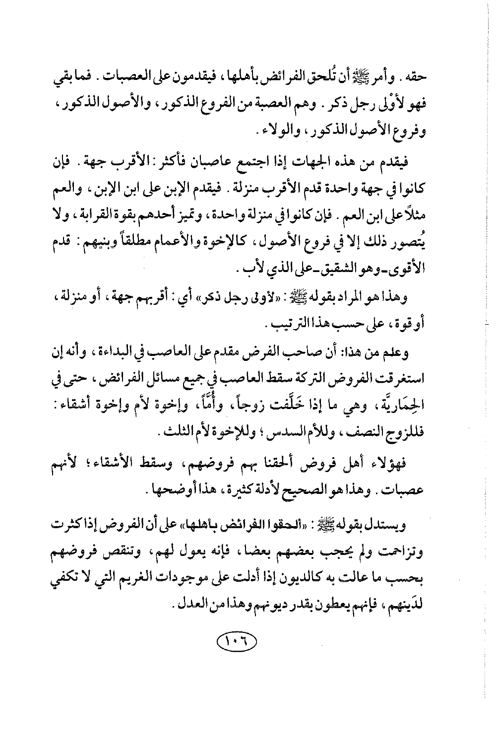 حقه، وأمر صلى الله عليه وسلم أن تلحق الفرائض بأهلها، فيقدمون على العصبات. فما بقي فهو لأولى رجل ذكر. وهم العصبة من الفروع الذكور، والأصول الذكور، وفروع الأصول الذكور، والولاء.