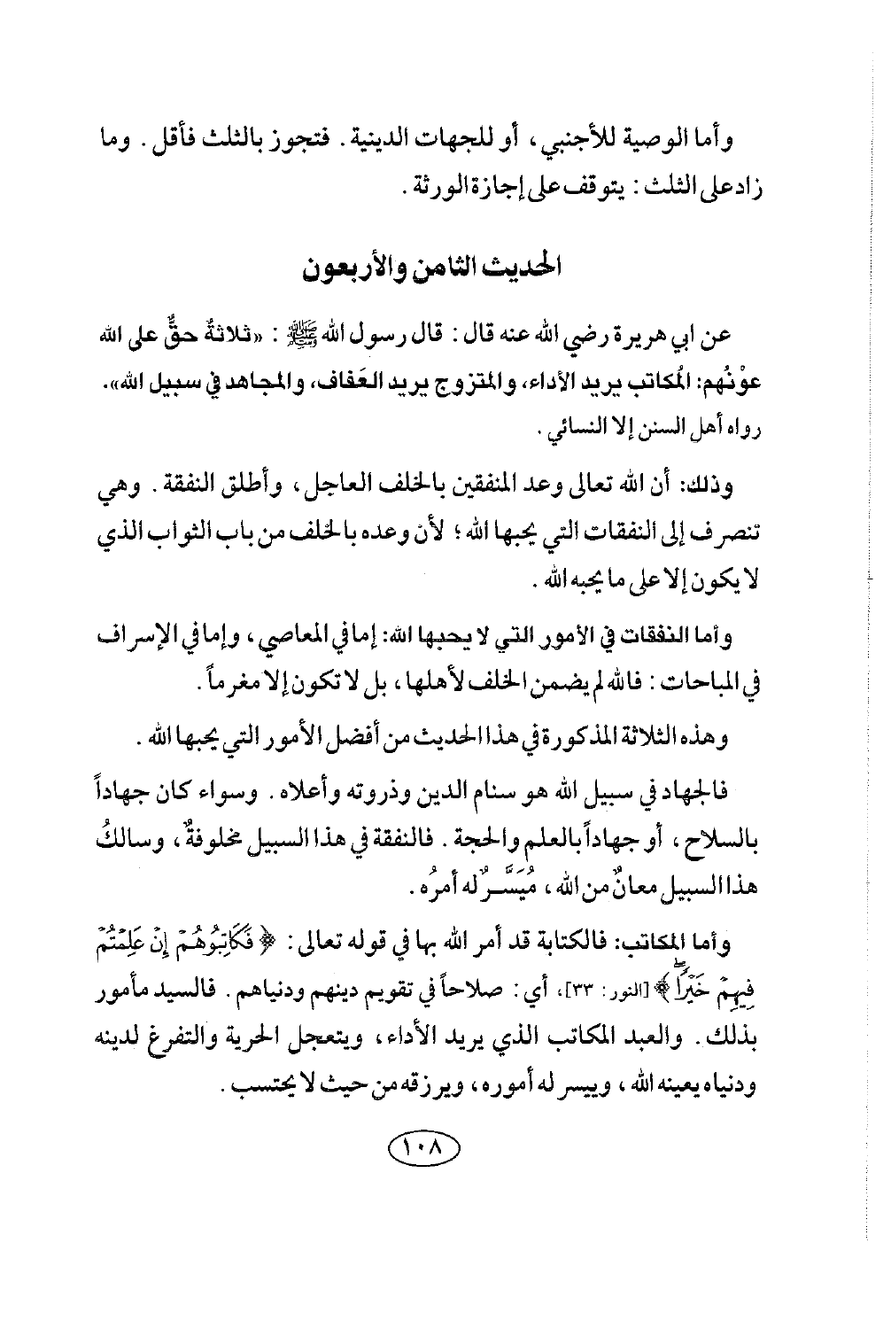 الحديث الثامن والأربعون عن أبي هريرة رضي الله عنه قال: قال رسول الله صلى الله عليه وسلم: «ثلاثة حق على الله عَوْنُهُمُ: الْمُكَاتَبُ يُرِيدُ الْأَدَاءَ، وَالْمُتَزَوِّجُ يُرِيدُ الْعَفَافَ، وَالْمُجَاهِدُ فِي سَبِيلِ اللَّهِ» رَوَاهُ أَهْلُ السُّنَنِ إلا النسائي.