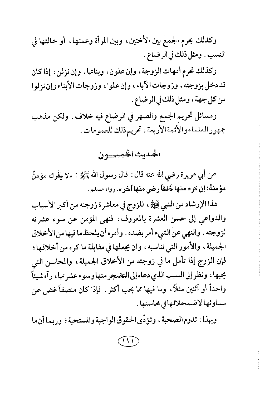 الحديث الخمسون عن أبي هريرة رضي الله عنه قال: قال رسول الله صلى الله عليه وسلم: «لَا يَفْرَكْ مُؤْمِنٌ مُؤِمْنِةً: إِنْ كَرِهَ مِنْهَا خلقا رضي منها آخر» . رواه مسلم.