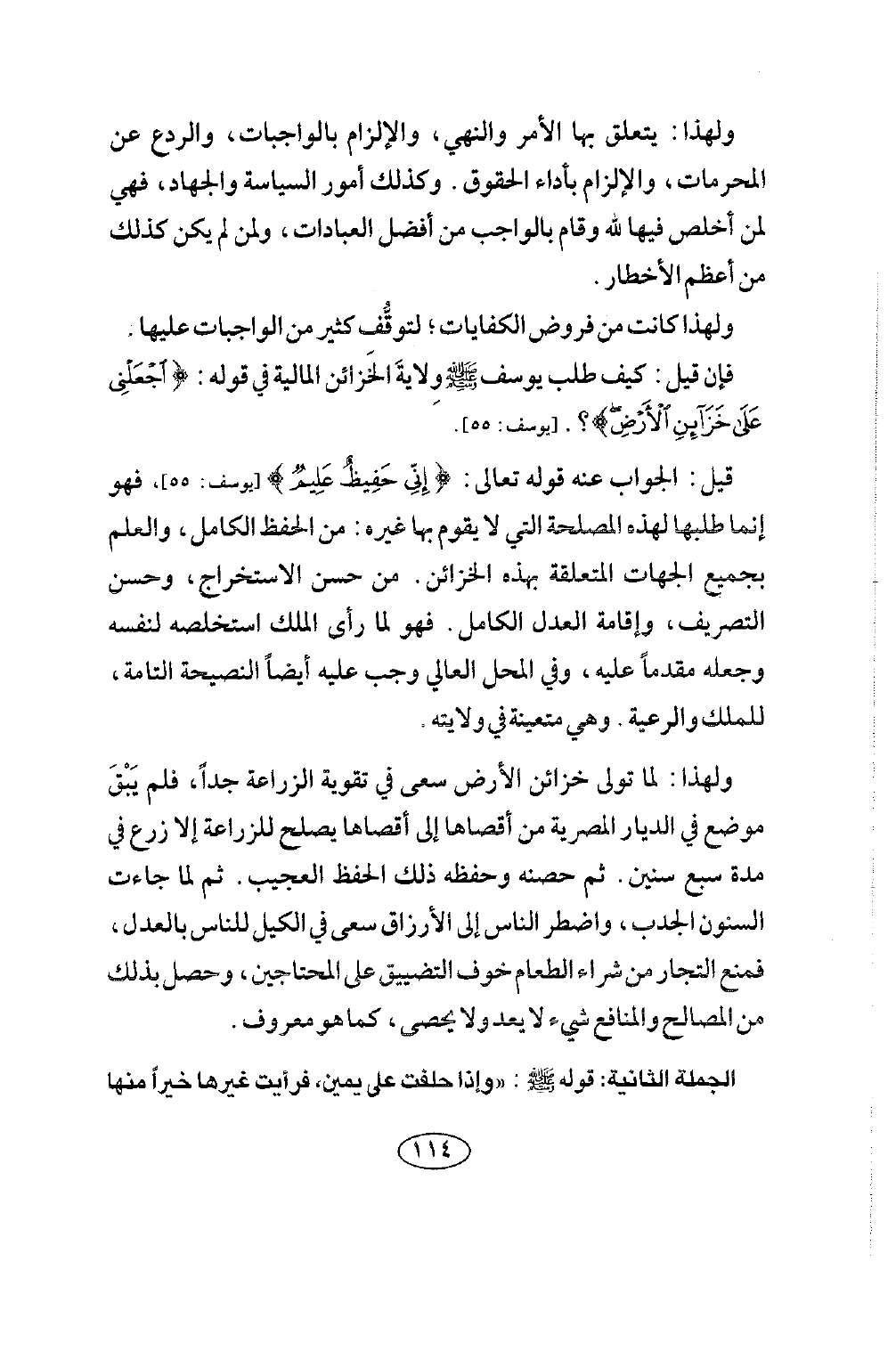 فهو إنما طلبها لهذه المصلحة التي لا يقوم بها غيره: من الحفظ الكامل، والعلم بجميع الجهات المتعلقة بهذه الخزائن. من حسن الاستخراج، وحسن التصريف، وإقامة العدل الكامل. فهو لما رأى الملك استخلصه لنفسه وجعله مقدما عليه، وفي المحل العالي، وجب عليه أيضا النصيحة التامة، للملك والرعية. وهي متعينة في ولايته.
