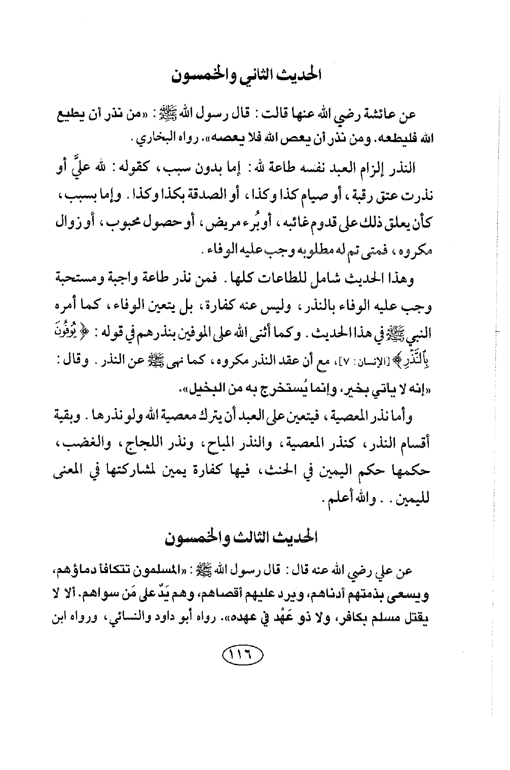 الحديث الثاني والخمسون عَنْ عَائِشَةَ رَضِيَ اللَّهُ عَنْهَا قَالَتْ: قَالَ رسول الله صلى الله عليه وسلم: «من نَذَرَ أَنْ يُطِيعَ اللَّهَ فَلْيُطِعْهُ، وَمَنْ نَذَرَ أَنْ يَعْصِيَ اللَّهَ فَلَا يَعْصِهِ» . رَوَاهُ الْبُخَارِيُّ: