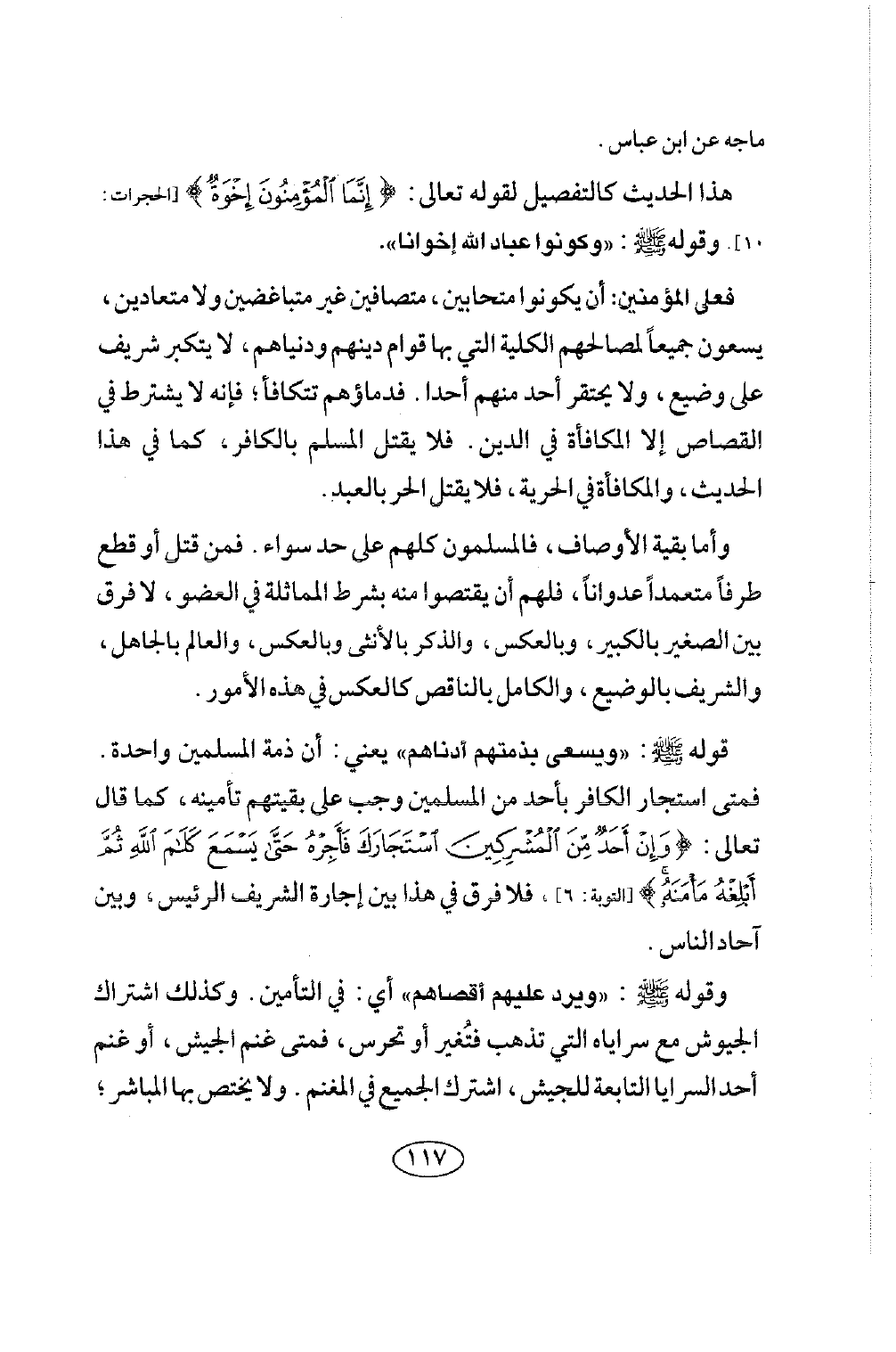 فعلى المؤمنين: أن يكونوا متحابين، متصافين غير متباغضين ولا متعادين، يسعون جميعا لمصالحهم الكلية التي بها قوام دينهم ودنياهم، لا يتكبر شريف على وضيع، ولا يحتقر أحد منهم أحدا. فدماؤهم تتكافأ، فإنه لا يشترط في القصاص إلا المكافأة في الدين، فلا يقتل المسلم بالكافر، كما في هذا الحديث، والمكافأة في الحرية، فلا يقتل الحر بالعبد.