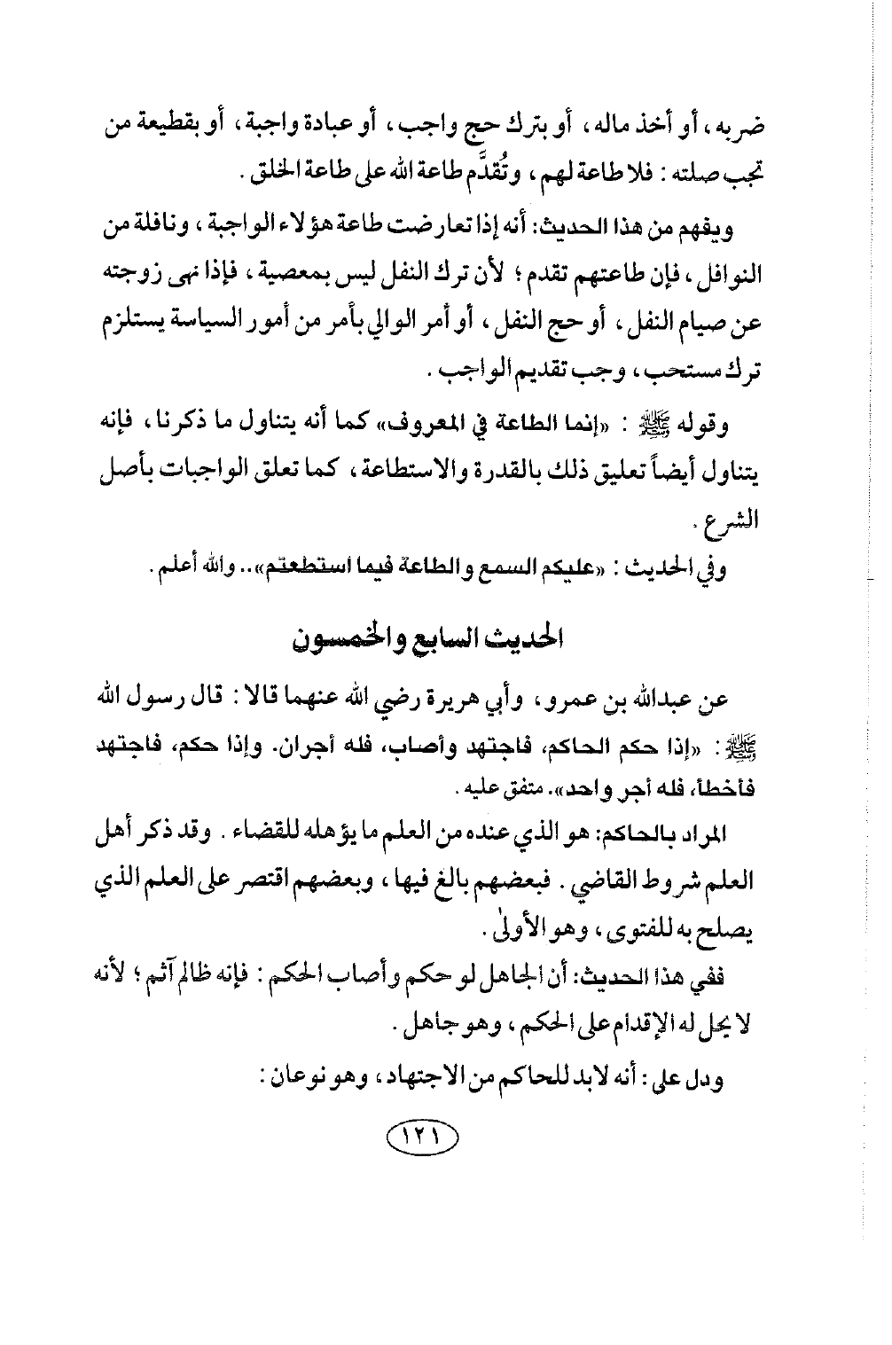الحديث السابع والخمسون عَنْ عَبْدِ اللَّهِ بْنِ عَمْرٍو، وَأَبِي هُرَيْرَةَ رَضِيَ اللَّهُ عَنْهُمَا قَالَا: قَالَ رَسُولُ اللَّهِ صلى الله عليه وسلم: «إِذَا حَكَمَ الْحَاكِمُ، فَاجْتَهَدَ وَأَصَابَ، فَلَهُ أَجْرَانِ. وَإِذَا حَكَمَ، فَاجْتَهَدَ فأخطأ، فله أجر واحد» . متفق عليه.