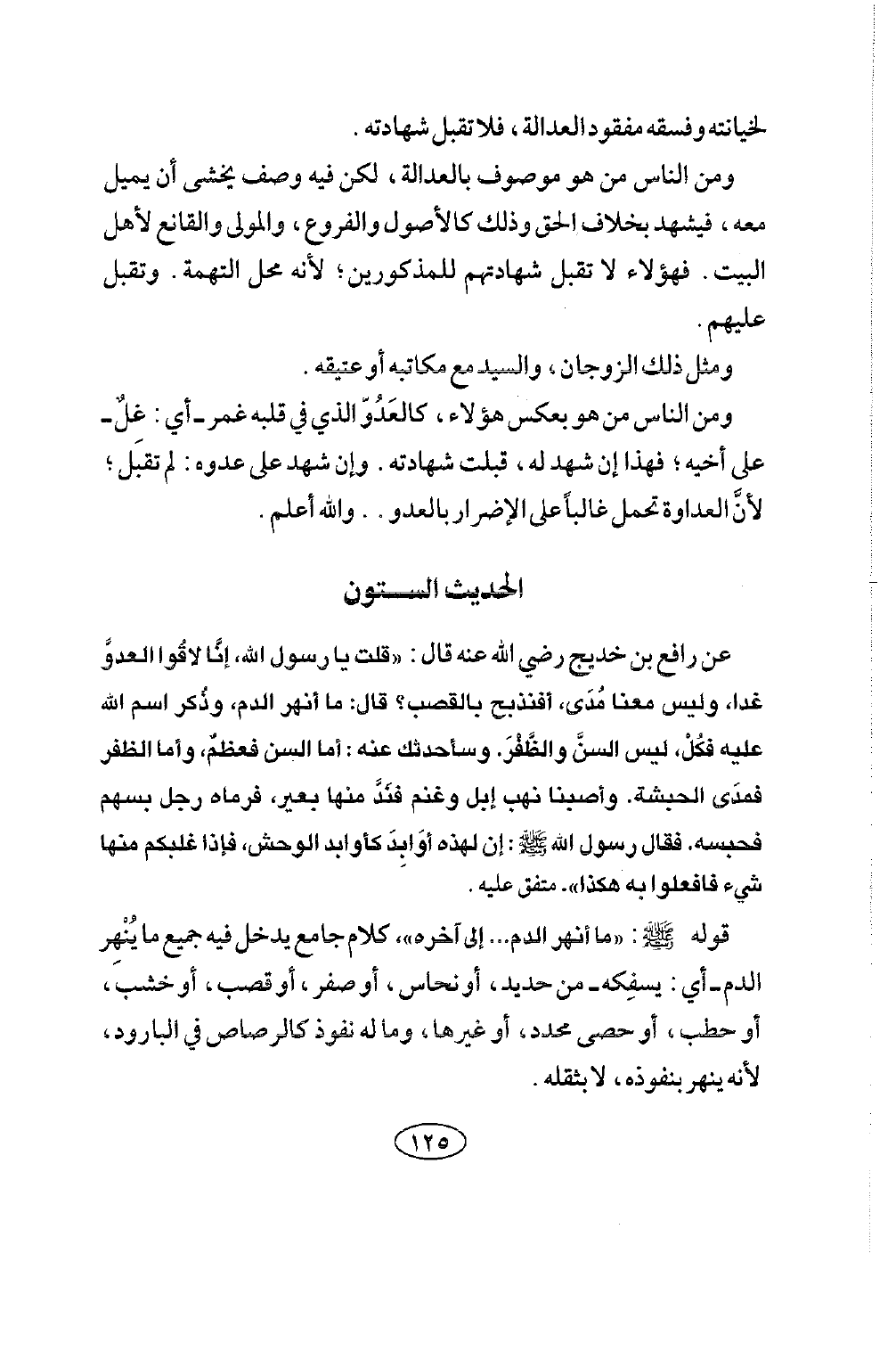الحديث الستون عَنْ رَافِعِ بْنِ خَدِيجٍ رضي الله عنه قال: «قلت: يا رسول الله. إنا لاقو الْعَدُوِّ غَدًا، وَلَيْسَ مَعَنَا مُدًى. أَفَنَذْبَحُ بِالْقَصَبِ؟ قَالَ: مَا أَنْهَرَ الدَّمَ وَذُكِرَ اسْمُ اللَّهِ عَلَيْهِ فَكُلْ، لَيْسَ السِّنَّ وَالظُّفُرَ. وَسَأُحَدِّثُكَ عَنْهُ أَمَّا السِّنُّ فَعَظْمٌ. وَأَمَّا الظُّفُرُ فَمُدَى الْحَبَشَةِ. وَأَصَبْنَا نَهْبَ إِبِلٍ وَغَنَمٍ فَنَدَّ مِنْهَا بَعِيرٌ، فَرَمَاهُ رَجُلٌ بِسَهْمٍ فَحَبَسَهُ. فَقَالَ رَسُولُ اللَّهِ صلى الله عليه وسلم: (إِنَّ لِهَذِهِ أَوَابِدَ كَأَوَابِدِ الْوَحْشِ، فَإِذَا غَلَبَكُمْ مِنْهَا شَيْءٌ فَافْعَلُوا به هكذا» . متفق عليه.