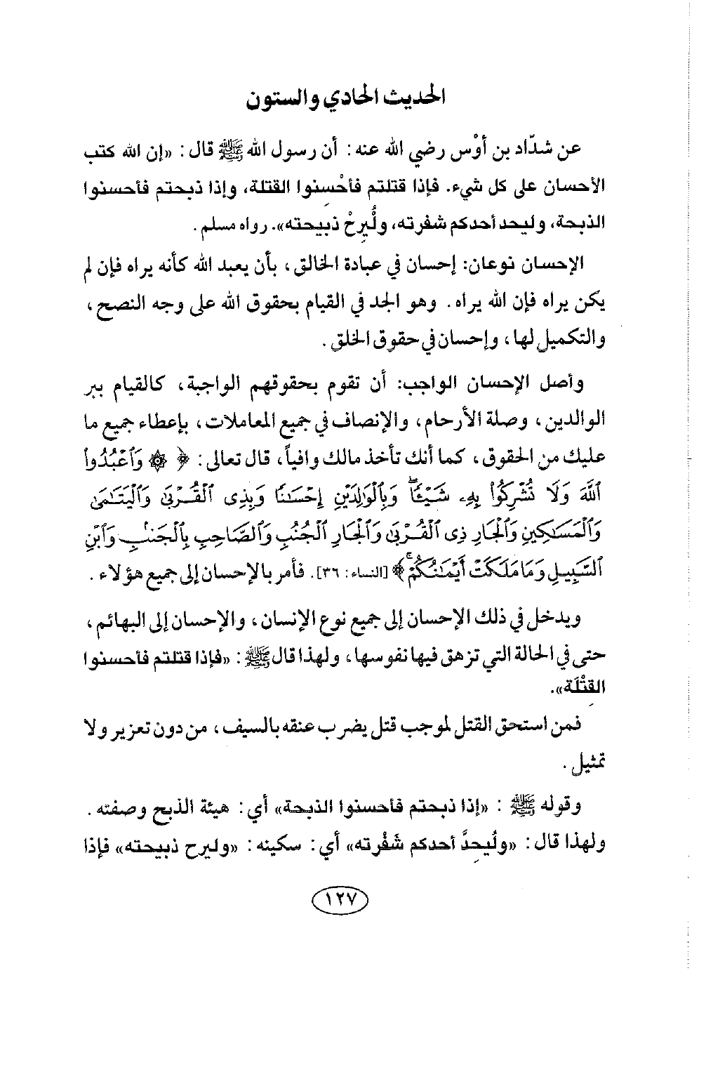 الحديث الحادي والستون عَنْ شَدَّادِ بْنِ أَوْسٍ رضي الله عنه: أن رسول الله صلى الله عليه وسلم: «إِنَّ اللَّهَ كَتَبَ الْإِحْسَانَ عَلَى كُلِّ شَيْءٍ، فَإِذَا قَتَلْتُمْ فَأَحْسِنُوا الْقِتْلَةَ، وَإِذَا ذَبَحْتُمْ فَأَحْسِنُوا الذِّبْحَةَ. وَلْيُحِدَّ أَحَدُكُمْ شَفْرَتَهُ، وَلْيُرِحْ ذَبِيحَتَهُ» . رَوَاهُ مسلم.