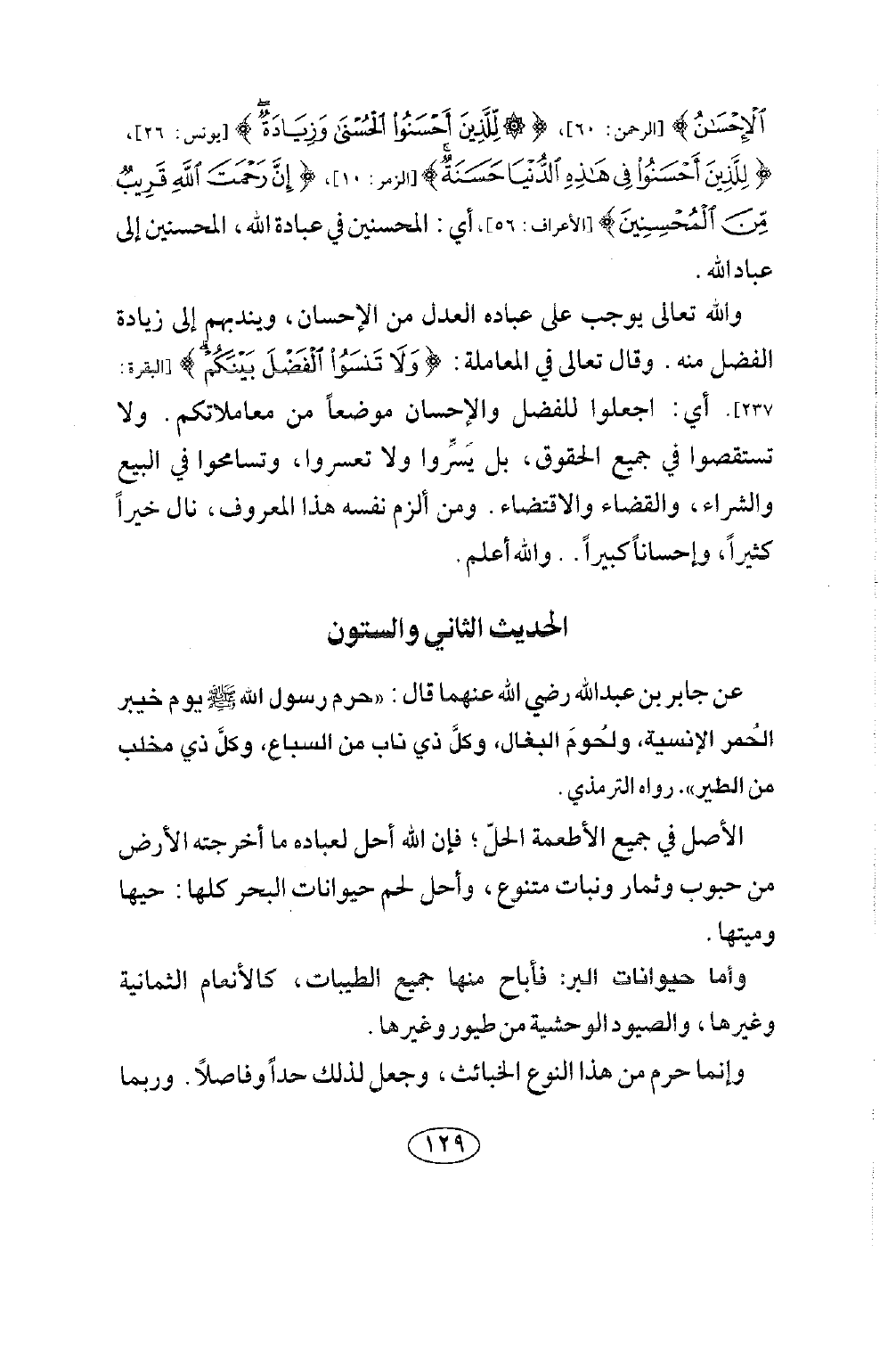 الحديث الثاني والستون عن جابر بن عبد الله رضي الله عنه قَالَ: «حَرَّمَ رَسُولُ اللَّهِ صلى الله عليه وسلم يَوْمَ خَيْبَرَ الْحُمُرَ الْإِنْسِيَّةَ، وَلُحُومَ الْبِغَالِ، وَكُلَّ ذِي نَابٍ مِنَ السِّبَاعِ، وَكُلَّ ذِي مخلب من الطير» رواه الترمذي.