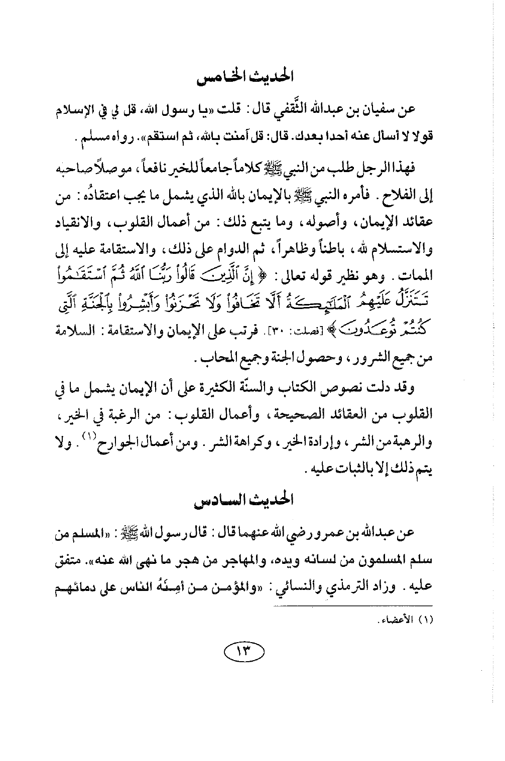 الحديث الخامس عَنْ سُفْيَانَ بْنِ عَبْدِ اللَّهِ الثَّقَفِيِّ قَالَ: قُلْتُ: «يَا رَسُولَ اللَّهِ، قُلْ لِي فِي الْإِسْلَامِ قَوْلًا لَا أَسْأَلُ عَنْهُ أَحَدًا بَعْدَكَ. قَالَ: قُلْ: آمَنْتُ بِاللَّهِ، ثُمَّ اسْتَقِمْ» . رَوَاهُ مسلم.