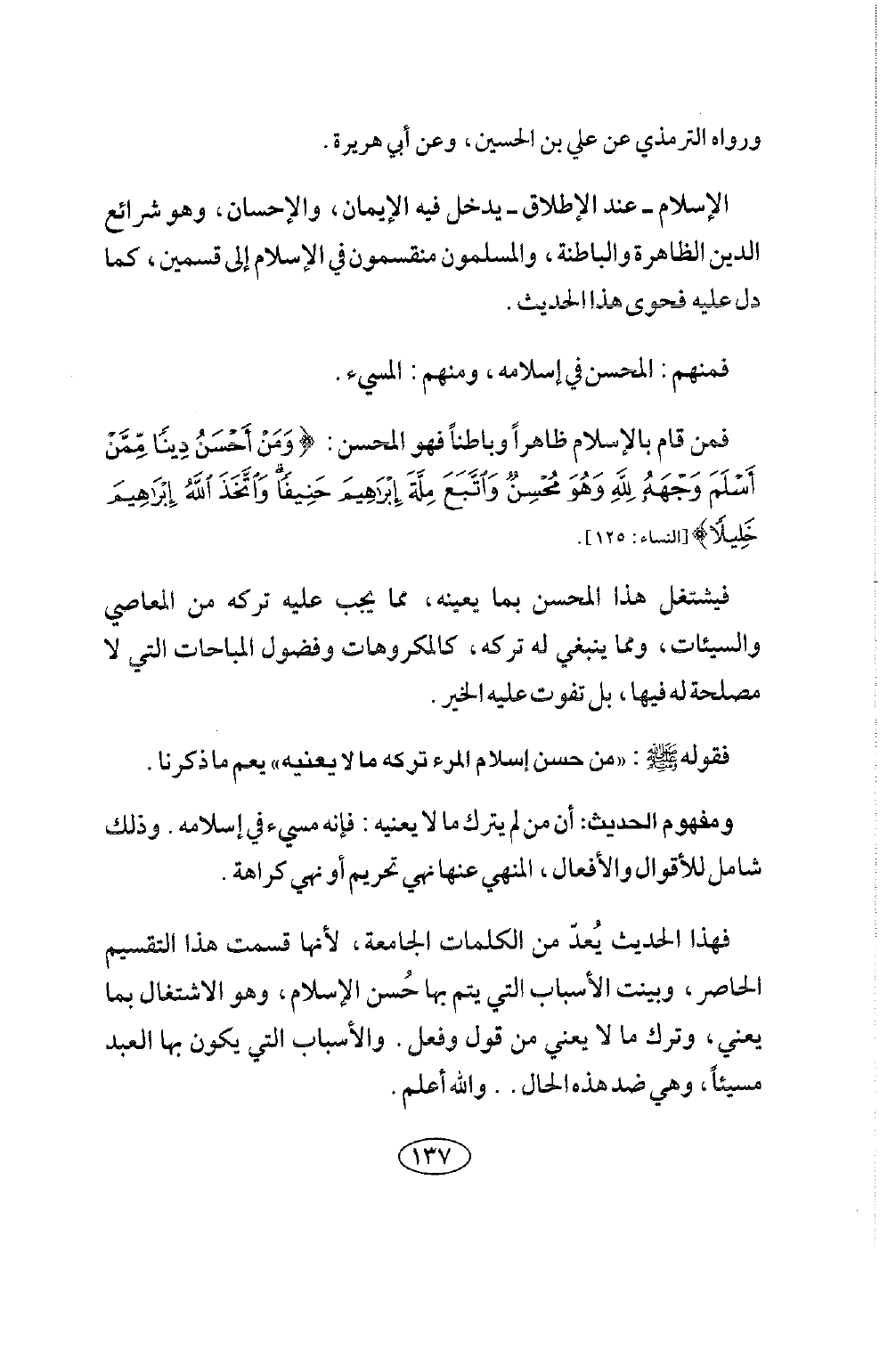 فهذا الحديث يعد من الكلمات العامة الجامعة، لأنها قسمت هذا التقسيم الحاصر، وبينت الأسباب التي يتم بها حسن الإسلام، وهو الاشتغال بما يعني، وترك ما لا يعني من قول وفعل، والأسباب التي يكون بها العبد مسيئا، وهي ضد هذه الحال. . والله أعلم.