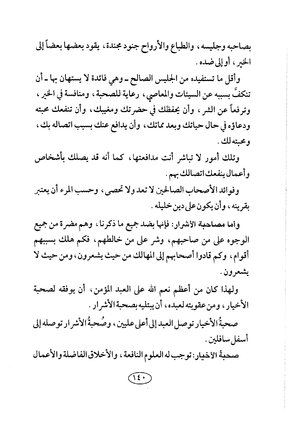 صحبة الأخيار توجب له العلوم النافعة، والأخلاق الفاضلة، والأعمال