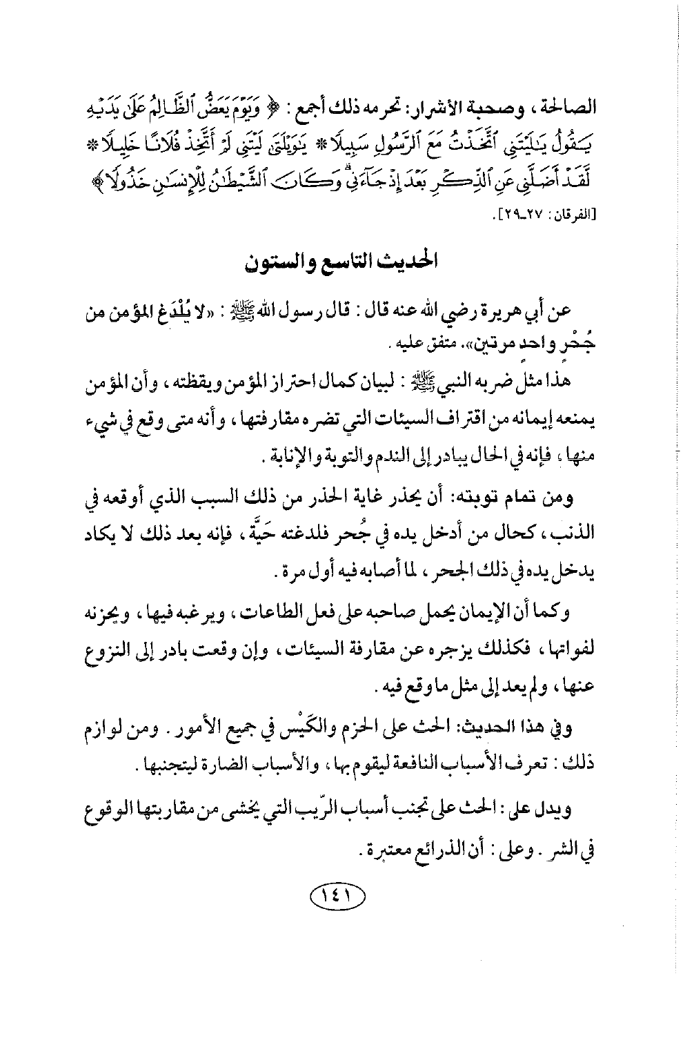 الحديث التاسع والستون عن أبي هريرة رضي الله عنه قال: قال رسول الله صلى الله عليه وسلم: «لا يلدغ المؤمن من جحر واحد مرتين» . متفق عليه.