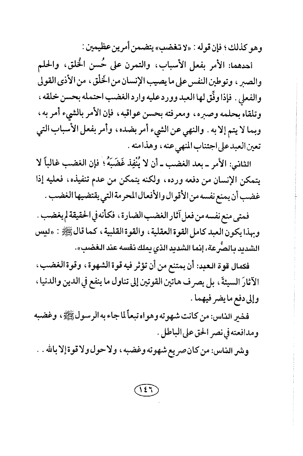 فمتى منع نفسه من فعل آثار الغضب الضارة، فكأنه في الحقيقة لم يغضب. وبهذا يكون العبد كامل القوة العقلية، والقوة القلبية، كما قال صلى الله عليه وسلم: «ليس الشديد بالصرعة، إنما الشديد الذي يملك نفسه عند الغضب» .