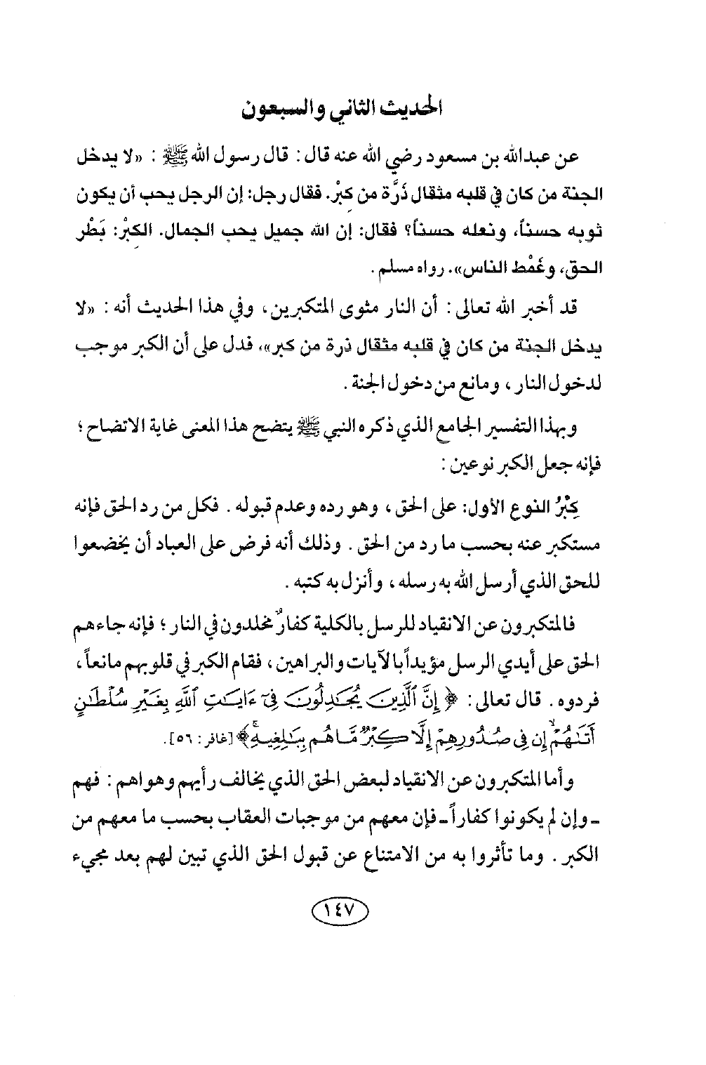 الحديث الثاني والسبعون عَنْ عَبْدِ اللَّهِ بْنِ مَسْعُودٍ رضي الله عنه قَالَ: قَالَ رَسُولُ اللَّهِ صلى الله عليه وسلم: «لَا يَدْخُلُ الْجَنَّةَ مَنْ كَانَ فِي قَلْبِهِ مِثْقَالُ ذَرَّةٍ مِنْ كِبْرٍ) فَقَالَ رَجُلٌ: إِنَّ الرَّجُلَ يُحِبُّ أَنْ يَكُونَ ثَوْبُهُ حسنا، ونعله حسنا؟ فقال: (إِنَّ اللَّهَ جَمِيلٌ يُحِبُّ الْجَمَالَ. الْكِبْرُ: بَطَرُ الحق، وغمط الناس» . رواه مسلم.