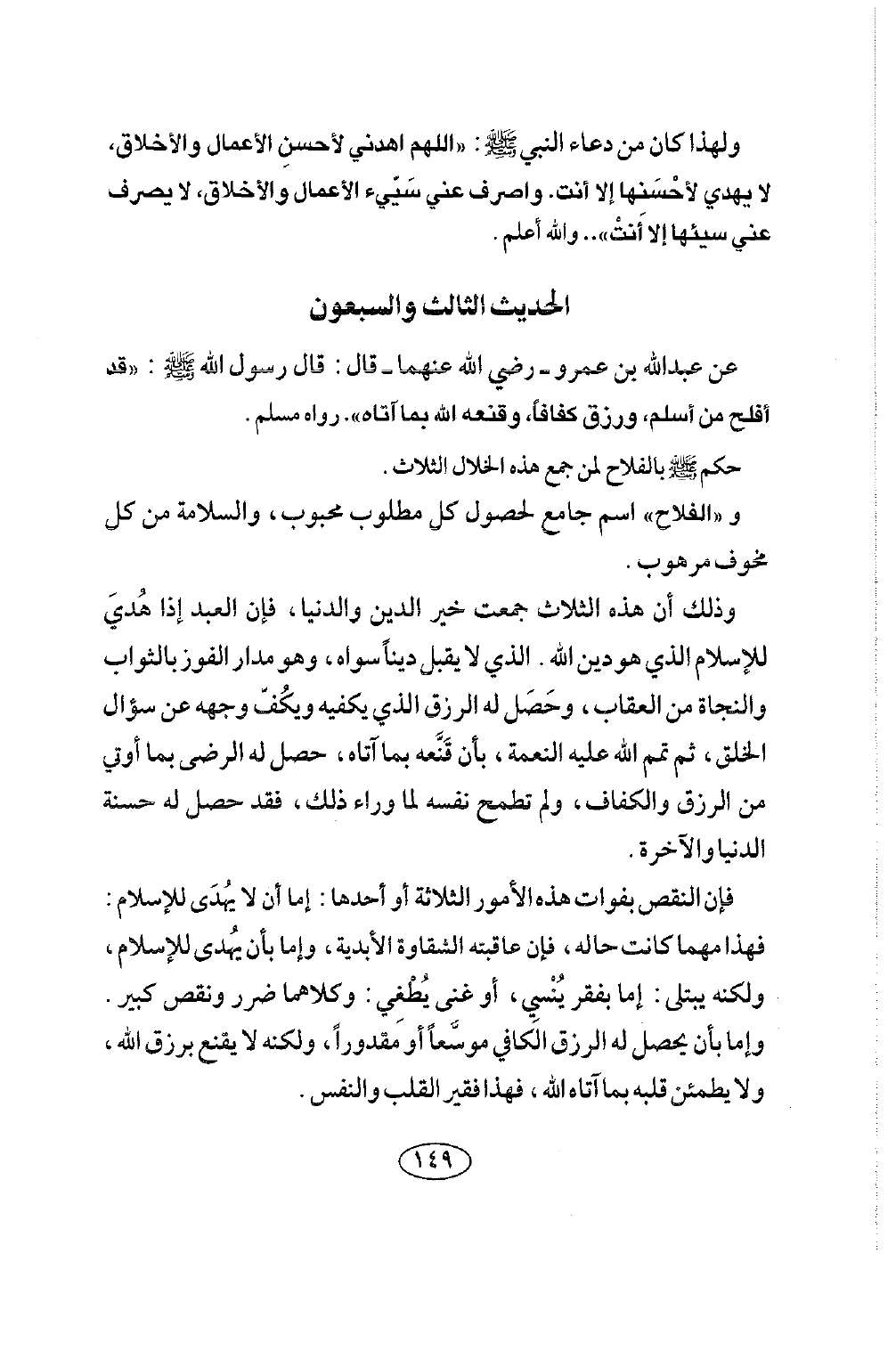 الحديث الثالث والسبعون عن عبد الله بن عمرو - رضي الله عَنْهُمَا - قَالَ: قَالَ رَسُولُ اللَّهِ صلى الله عليه وسلم: «قَدْ أَفْلَحَ مَنْ أَسْلَمَ وَرُزِقَ كَفَافًا، وَقَنَّعَهُ اللَّهُ بِمَا آتَاهُ» . رَوَاهُ مُسْلِمٌ.