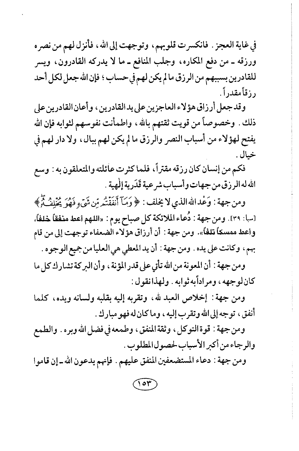 وقد جعل أرزاق هؤلاء العاجزين على يد القادرين، وأعان القادرين على ذلك، وخصوصا من قويت ثقتهم بالله، واطمأنت نفوسهم لثوابه فإن الله يفتح لهؤلاء من أسباب النصر والرزق ما لم يكن لهم ببال، ولا دار لهم في خيال.