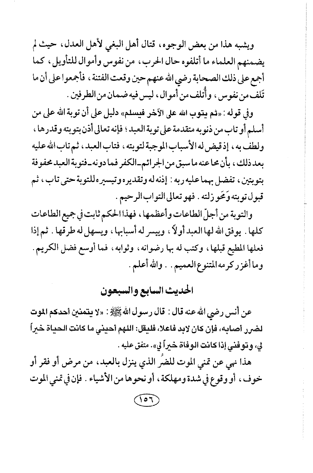 الحديث السابع والسبعون عَنْ أَنَسٍ رضي الله عنه قَالَ: قَالَ رَسُولُ اللَّهِ صلى الله عليه وسلم: «لَا يتمنين أحدكم الموت لضرر أَصَابَهُ، فَإِنْ كَانَ لَا بُدَّ فَاعِلًا، فَلْيَقُلْ: اللَّهمَّ أَحْيِنِي مَا كَانَتِ الْحَيَاةُ خَيْرًا لِي، وَتَوَفَّنِي إِذَا كَانَتِ الْوَفَاةُ خَيْرًا لِي» مُتَّفَقٌ عليه.